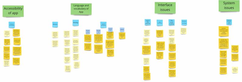 It was during this affinity diagramming process when we started to add categories to our quotes (blue post-its). Some of the quotes required several layering of analysis and categorisation. We found out that most of the layered ones concentrate around the need for clarification of how to interact with the app, and the definitions of technical terms used. This would be then be the focus of our final iteration.