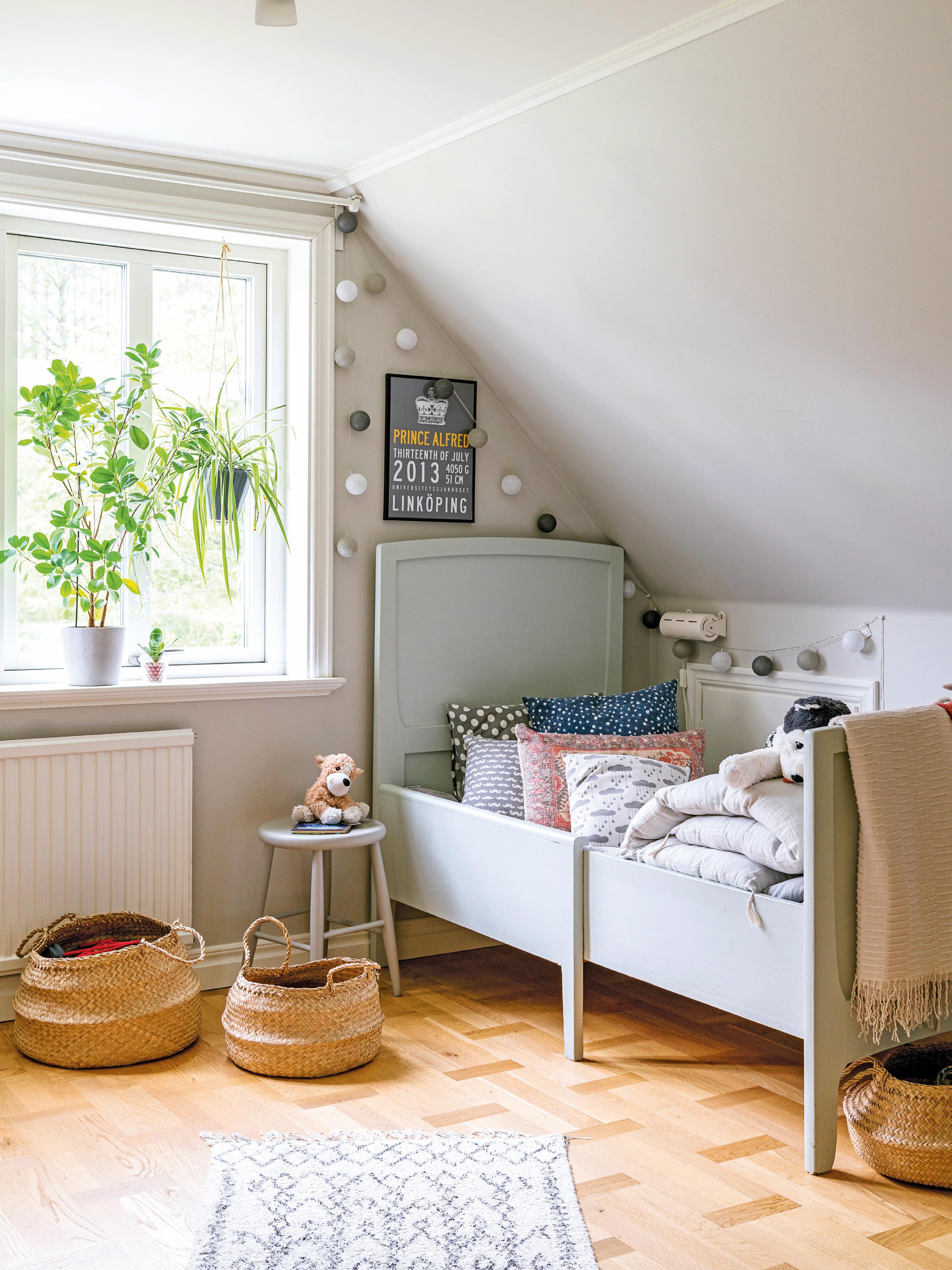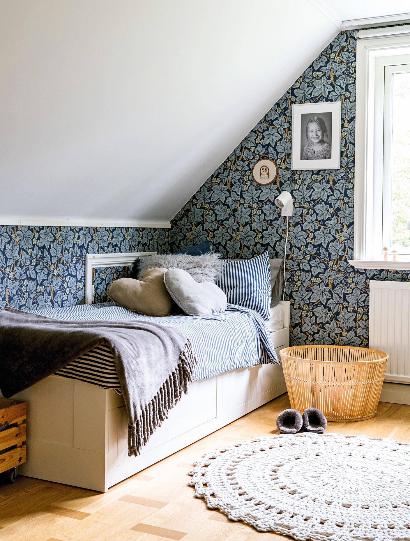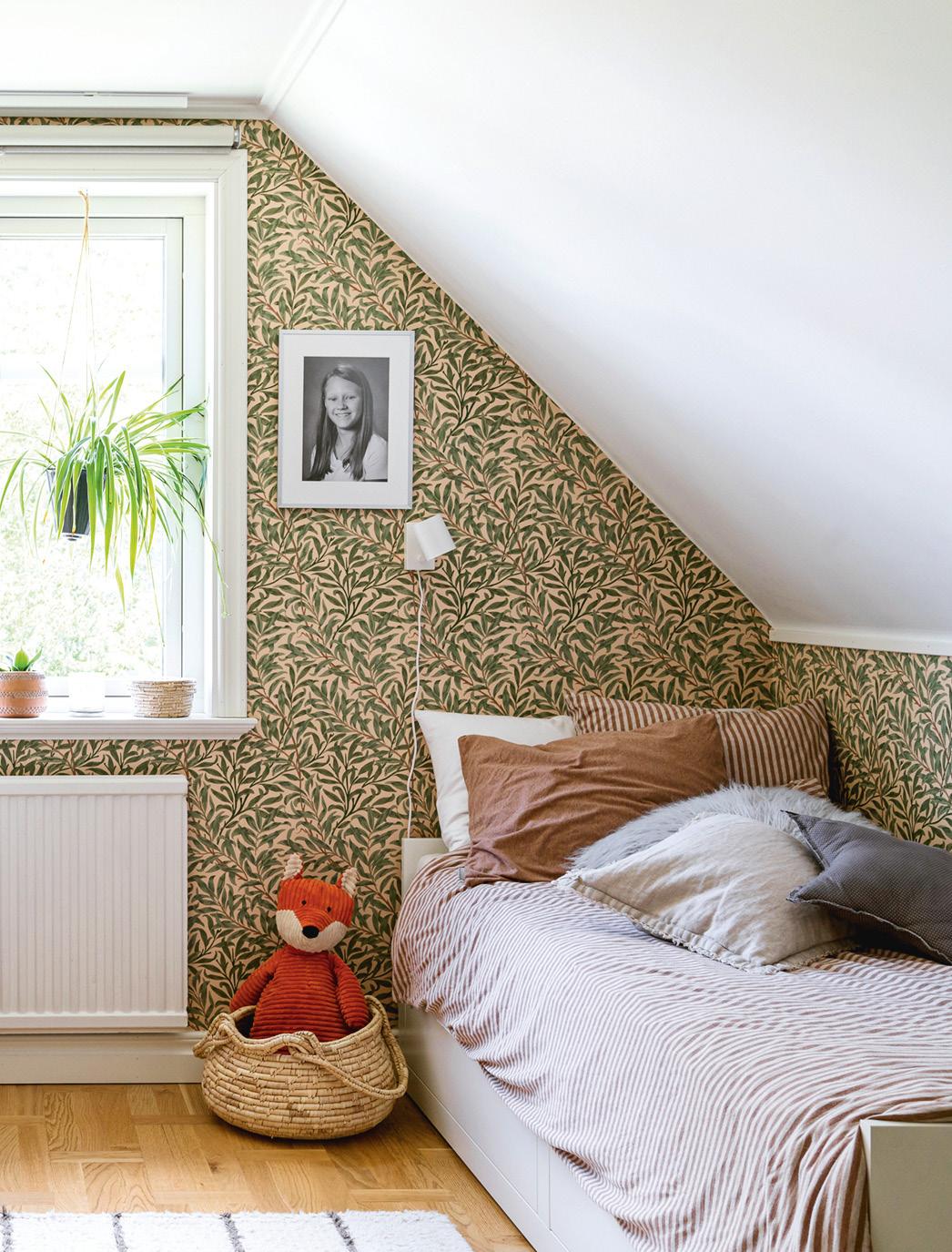 Start out in the children’s rooms. Scandinavian wallpapers are a great way of adding personality and colour to a child’s room while keeping things soft and muted –try a nude pink or denim blue patterned paper.