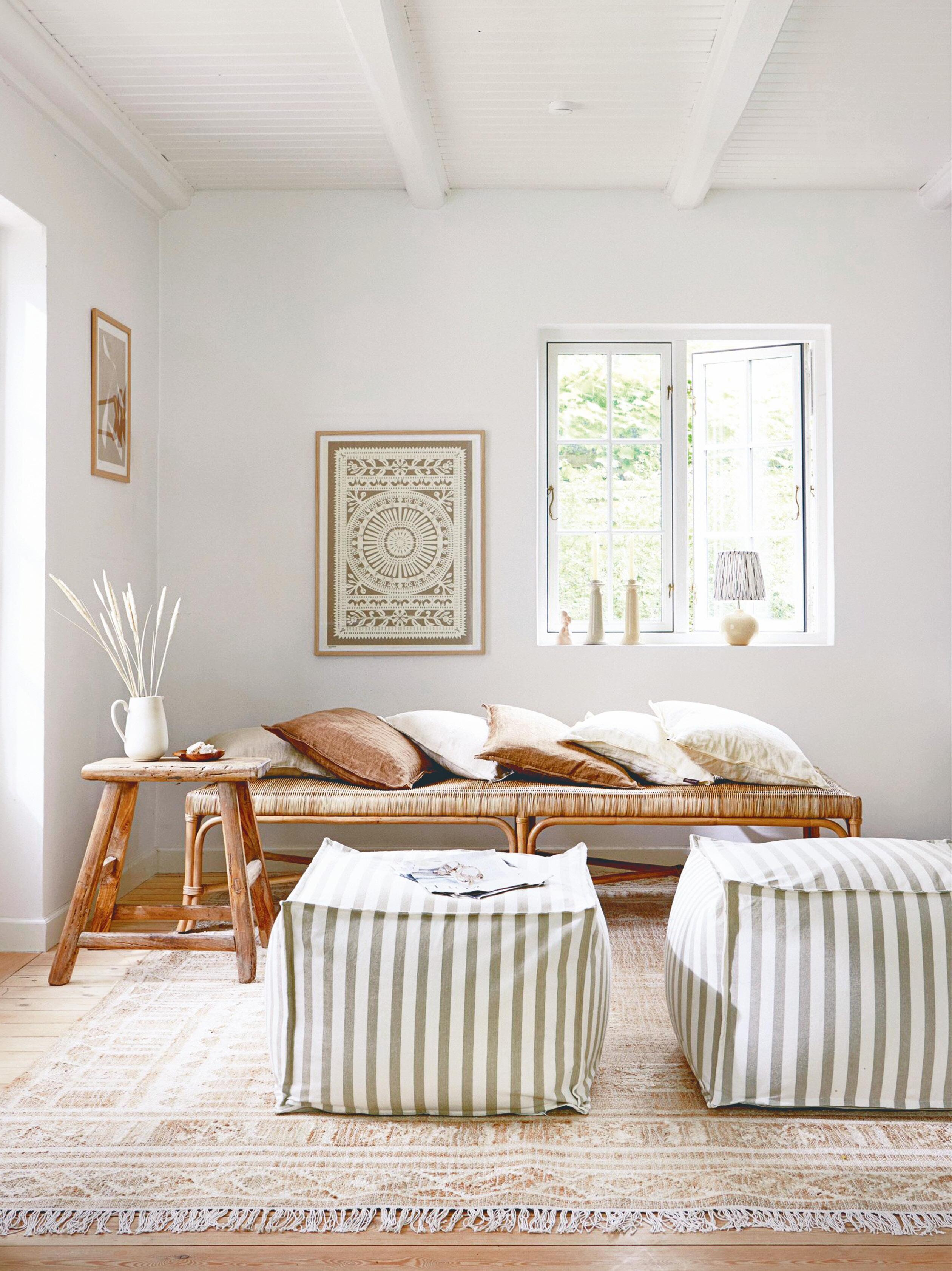 LEFT Rimini Desert pouf, €173; rattan daybed, €1,205; Aztec Nature rug, €923.75; linen cushion covers, €46.75 each; all bungalow.dk