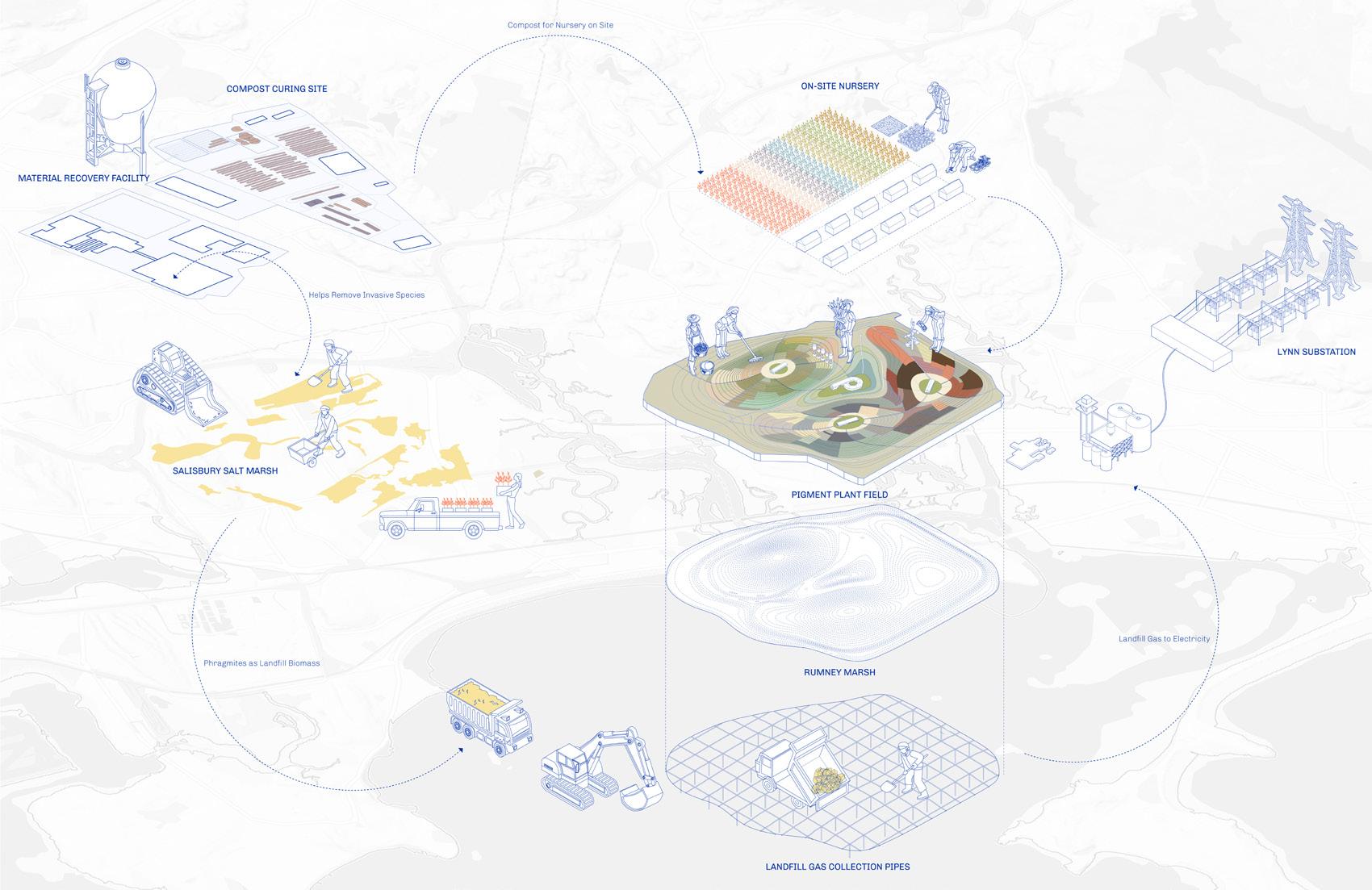 The Rumney landfill transformation features an underground methane facility for energy, a surface-level textile dye site for local revitalization and soil rehabilitation, reducing environmental runoff while fostering job creation and reevaluating globalization for a sustainable future, ultimately making the area a colorful symbol of environmental commitment and community enhancement.