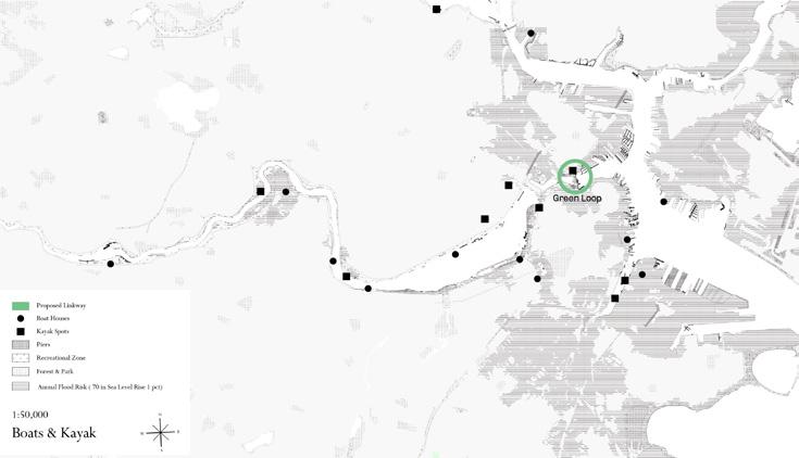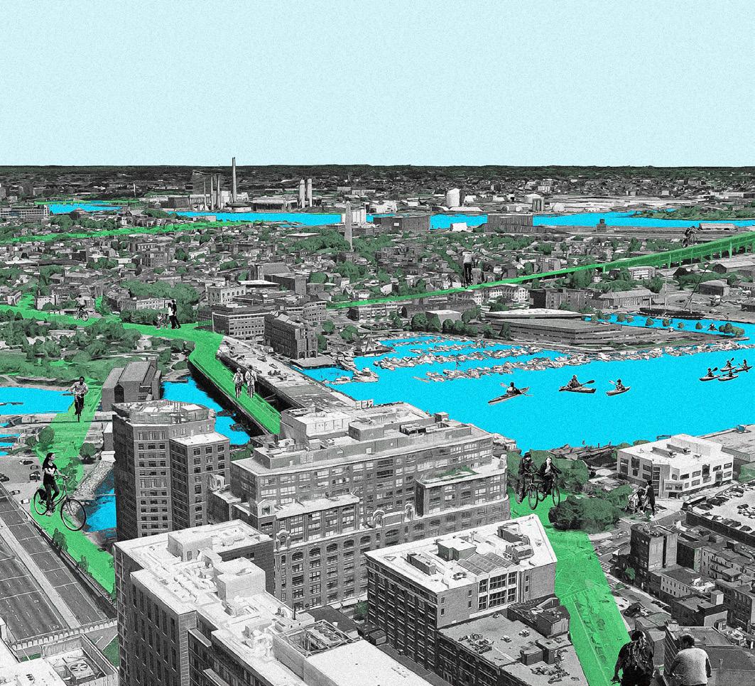 I propose a green and blue route network: rising tides as an opportunity for new connections in Charlestown. This initiative aims to harmonize lifestyle choices with the green and blue routes to face impending water levels, promoting transportation like biking, boating, and kayaking. It envisions a community where people of all ages—seniors, children, and parents with strollers—can conveniently and quickly move across the area and access neighboring cities via eco-friendly transportation.