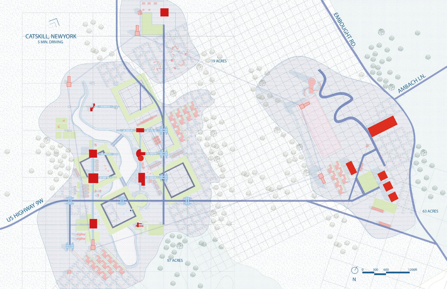 Therefore, we chose our site at an abandoned airport space in Catskill, New York. It has access to both New York and Boston via train and highway. The site is relatively open flat ground with a pond in the center, which provides design potentials for innovative generation ways.