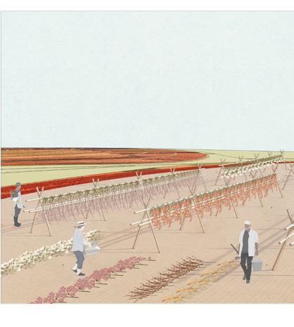 While enjoying the pigment plants field, people ascend the slope to reach the pigment workshops.