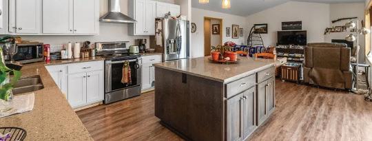 open living, a beautiful kitchen, gas furnace, A/C, and a wood stove. Recent upgrades include custom rock work, engineered flooring, new