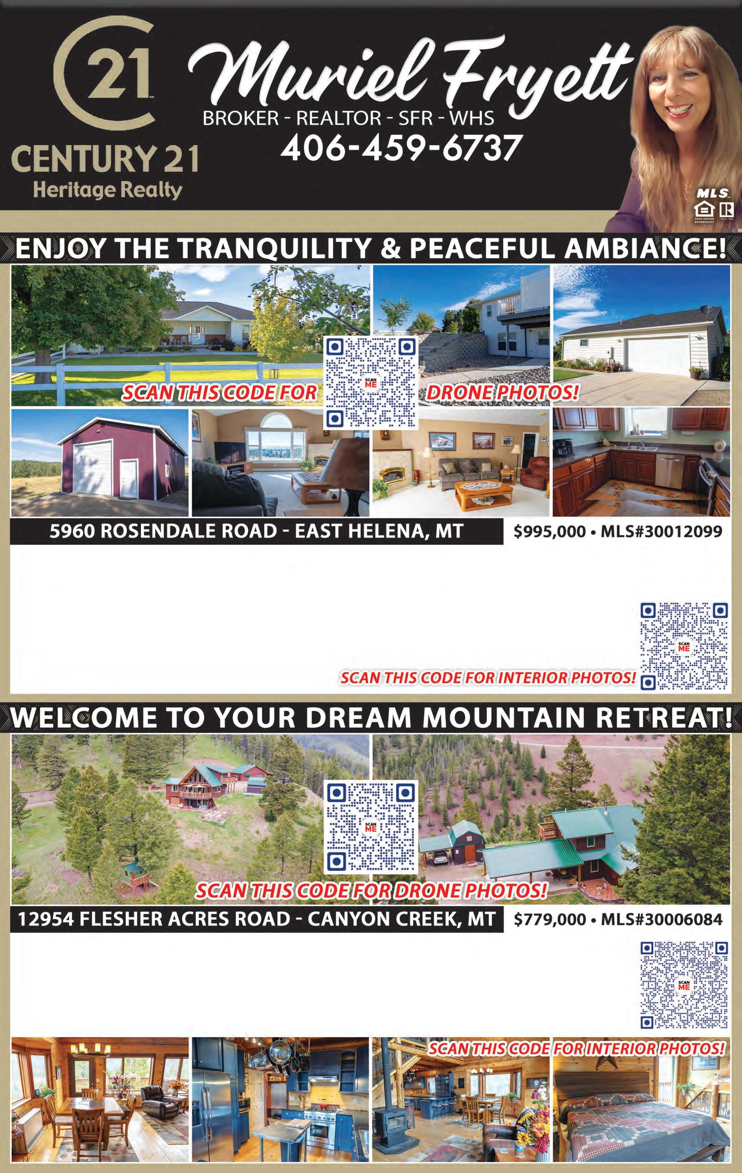 406-431-1356 $178,888 - MLS#30010897 4380 N MONTANA AVENUE • HELENA, MT Great 2 bed home, hardwood floors, open floor plan on 3 ac. No covenants. 3 car shop/shed w/the remaining acreage used as storage area. County zoning has changed everything in the area to rural. Seller feels it has commercial value as it is right off N Montana Ave. Call Jill Sampson. 406-439-8331 $498,800 - MLS#30013037 11 CLOVERVIEW DR UNITS 10 & 11 • HELENA, MT Home sits on 20.61 ac w/spectacular views of Helena area. Main level has 3 beds, 2 baths. Open concept kitchen & living room. Kitchen has granite counter tops w/large island. The separate garage is 30x40 w/lg garage door. There is also a welding bench in the garage. There is a lot of potential on this beautiful property. Call Lynette Avery. 406-439-7215 $989,000 - MLS#30012947 6630 LONE PINE ROAD • HELENA, MT Home sits on 20.61 ac w/spectacular views of Helena area. Main level has 3 beds, 2 baths. Open concept kitchen & living room. Kitchen has granite counter tops w/large island. The separate garage is 30x40 w/lg garage door. There is also a welding bench in the garage. There is a lot of potential on this beautiful property. Call Lynette Avery. 406-439-7215 $745,900 - MLS#30012488