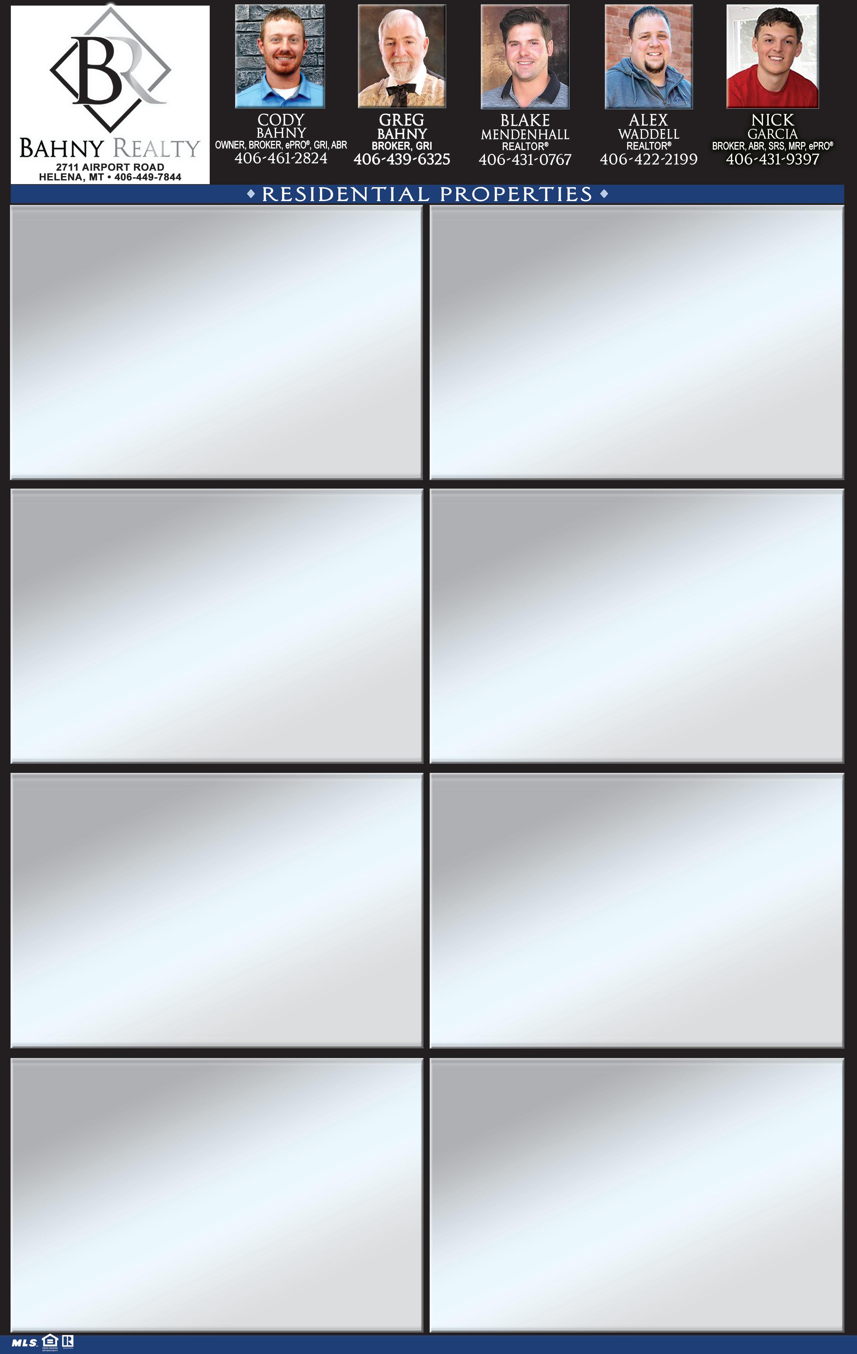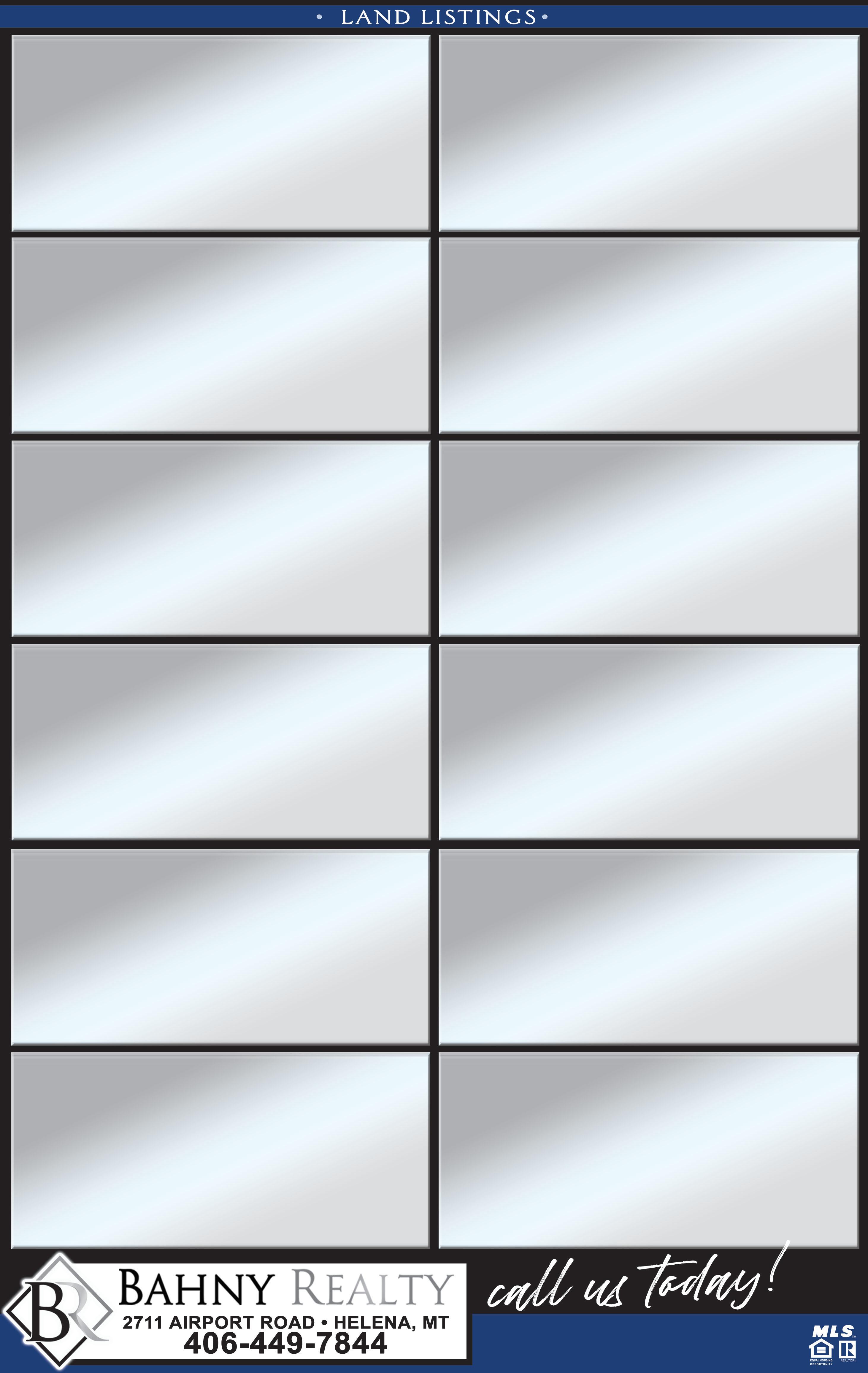 pg.11 www.CapitalRealEstateConnection.com Tom@BahnyRealty.com Kathy@BahnyRealty.com Monica@BahnyRealty.com Mike@BahnyRealty.com Steve@BahnyRealty.com Ray@BahnyRealty.com $225,000 ♦ MLS#30018561 ♦ Septic system & electricity put in. ♦ Commerce, schools, shopping & recreation just a mins away. CALL KATHY SUTTON 406-459-8018 $169,500 ♦ MLS#30021392 ♦ 18.97 acres surrounded by BLM Year-round access to hundreds of miles of trails/public land ♦ North end nearly level w/tremendous views CALL CODY BAHNY 406-461-2824 NOW $975,000 ♦ MLS# 30007069 ♦ Great investment property! ♦ 10.00 ac w// No covenants/zoning! ♦ Great views of Canyon Ferry lake ♦ Daily traffic count of over 6500 vehicles /day CALL CODY BAHNY 406-449-7844 ADDITIONAL LISTINGS: www.B ahny R ealty.com $380,000 ♦ MLS#30015923 ♦ 5.16 acre one-of-a-kind property ♦ Horses, livestock, manufactured & modular homes welcome ♦ Views overlooking Helena Valley, Holding Reservoir, & Lake Helena CALL CODY BAHNY 406-461-2824 3255 RANGER DRIVE ♦ HELENA, MT PRICE REDUCED! COMMERCIAL BUSINESS OPPORTUNITY! $150,000 ♦ MLS#30013347 ♦ Owner financing available ♦ Great opportunity to take over an established business ♦ All necessary equipment included ♦ Seller is willing to lease equipment and office space CALL NICK GARCIA 406-431-9397 AGRI FEEDS PRICE REDUCED! 3159 EASTVIEW DRIVE ♦ EAST HELENA, MT 7 GRANDVIEW LOOP ♦ TOWNSEND, MT NOW $425,000 MLS#30005540 ♦ Deluxe Recreational Cabin! ♦ 1728 sq ft 1 bed 1 bath ♦ 2 mining claims total: 37.47 ac ♦ Year around Creek frontage CALL NICK GARCIA 406-431-9397 PRICE REDUCED! TBD CATARACT CREEK ROAD ♦ BASIN, MT TBD KEATING GULCH ROAD ♦ RADERSBURG, MT NOW $285,000 ♦ MLS#30012073 ♦ Recreational property fronting the Blackfoot River ♦ 2 bed 1 bath cabin on 3 ac w/ year around access ♦ Additional RV hookup with water, power and septic ♦ Comes with a tractor and plow truck CALL ALEX WADDELL 406-422-2199 OR CODY BAHNY 406-461-2824 $5,000 BUYER CREDIT!!! NOW $1,150,000 ♦ MLS# 30006807 ♦ 5 bed, 2 bath, 2,094 home on 22.85 acres, Merritt Ranch - Homesteaded in 1866 ♦ Built-in Barbecue, Barbecue, Dog Run, Fire Pit, Gas Grill, Lighting, Private Entrance, Private Yard, RV Hookup, Storage, Propane Tank - Owned, Two irrigated hay fields ♦ Deck, Enclosed, Porch, Canal, City Lights, Hills, Mountains, Pasture, Creek/Stream CALL CODY BAHNY 406-461-2824 OR GREG BAHNY 406-439-6325 PRICE REDUCED! 3680 MERRITT LANE ♦ HELENA, MT $725,000 ♦ MLS# 30022374 ♦ 3 bed, 2 bath, 1,630 SF home in Wheat Ridge Estates ♦ Fully landscaped 2.01 acre lot. Includes 40x60 shop w/14ft doors. CALL NICK GARCIA 406-431-9397 OR CODY BAHNY AT 406-431-9397 2280 SPRING WHEAT LOOP ♦ EAST HELENA, MT PRICE REDUCED! 2172 BLACKBURN DRIVE ♦ LINCOLN, MT NEW LISTING!