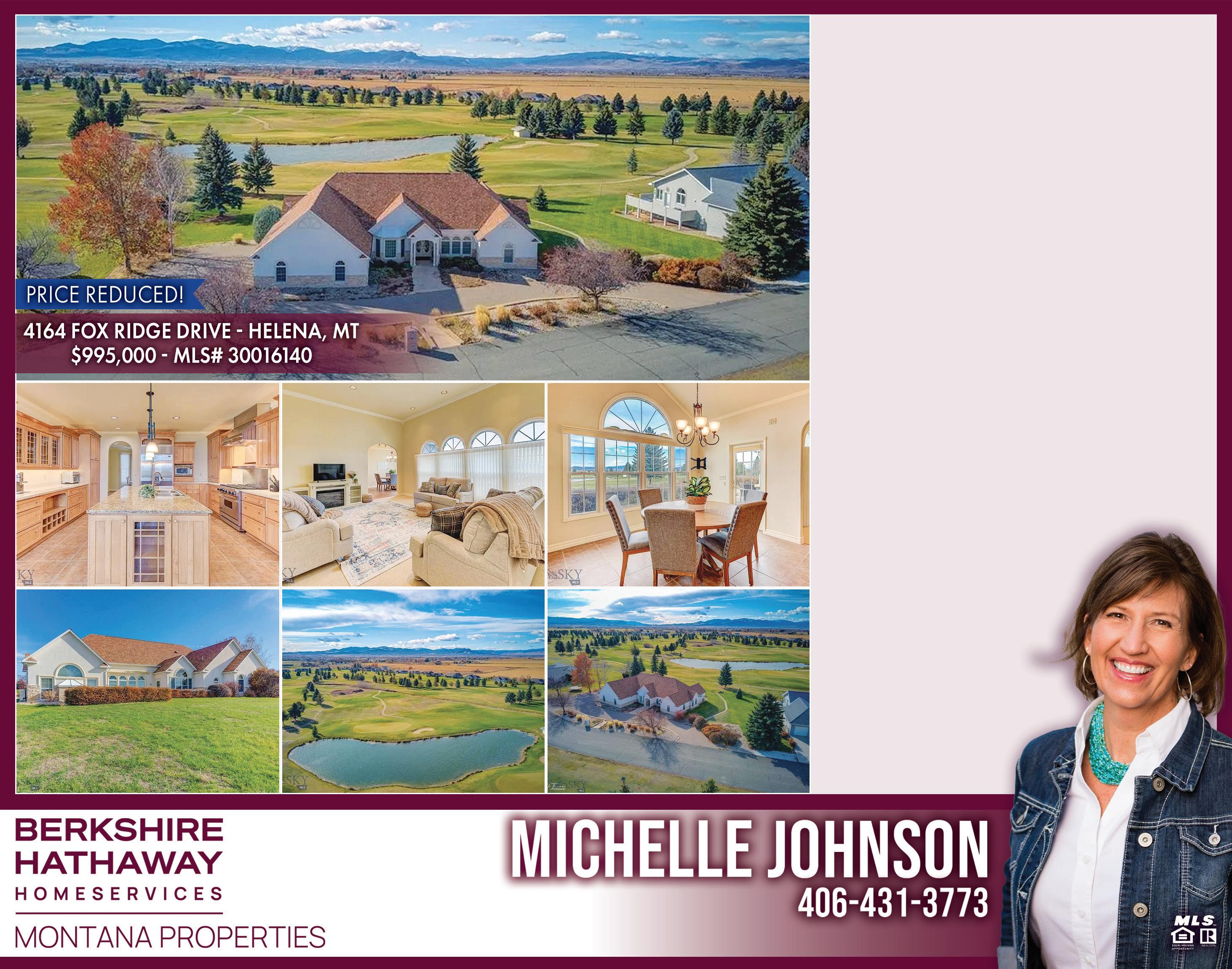 Don’t miss a remarkable opportunity to own this 3,514 sqft executive home, a masterpiece nestled on a top-notch golf course w/breathtaking views. This single-lvl residence w/attached threecar garage is a testament to sophistication, offering a seamless blend of class & functionality. The gourmet kitchen is a chef’s dream, featuring top-of-the-line SS appliances, custom cabinetry, & a grand, granite center island. Whether you are entertaining guests or preparing a quiet dinner for two, this kitchen is equipped to meet the highest culinary standards. From the breakfast nook, step outside onto the patio, perfect for dining while enjoying the sunsets. The master suite is a private retreat, complete w/a spalike en-suite, featuring a soaking tub, a walk-in shower, & dual vanities, oversized walk-in closet & nearby laundry room. On opposite side of the house, find additional bedrooms, a full bath, plus flex space w/a gas fireplace & outdoor access. As you enter through the grand foyer, you will notice the living area boasts expansive windows, framing panoramic views of the manicured golf course greens & beyond, providing a serene backdrop to your everyday life. This residence offers defined spaces w/ choices for elegant dining, a separate office, or additional den areas. Every closet throughout the house is designed for maximum ease-of-use & tons of organized storage. Wake up to the sun rising over the golf course, w/each room offering unparalleled views & an abundance of natural light. The home is designed w/ comfort in mind, creating an inviting atmosphere that accentuates the home’s timeless elegance. The property is situated to create a sense of privacy & tranquility. Additional amenities include a three-car garage w/additional golf cart garage, ensuring that every aspect of your lifestyle is catered to w/style & convenience. You’ll have that country feel w/paved roads & be 10 minutes from Costco & the Helena Airport. Hauser Lake is 7 mins away & Canyon Ferry Lake is 15 mins from your doorstep. So, if fishing, hunting, or water fun are your thing, this property offers that too! This executive home is a rare gem, offering the epitome of living on the golf course, where every detail has been carefully curated to provide a life of comfort & sophistication. michelle.johnson@bhhsmt.com