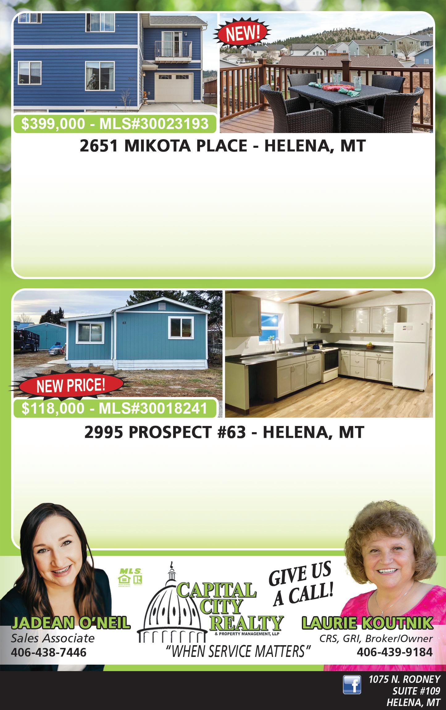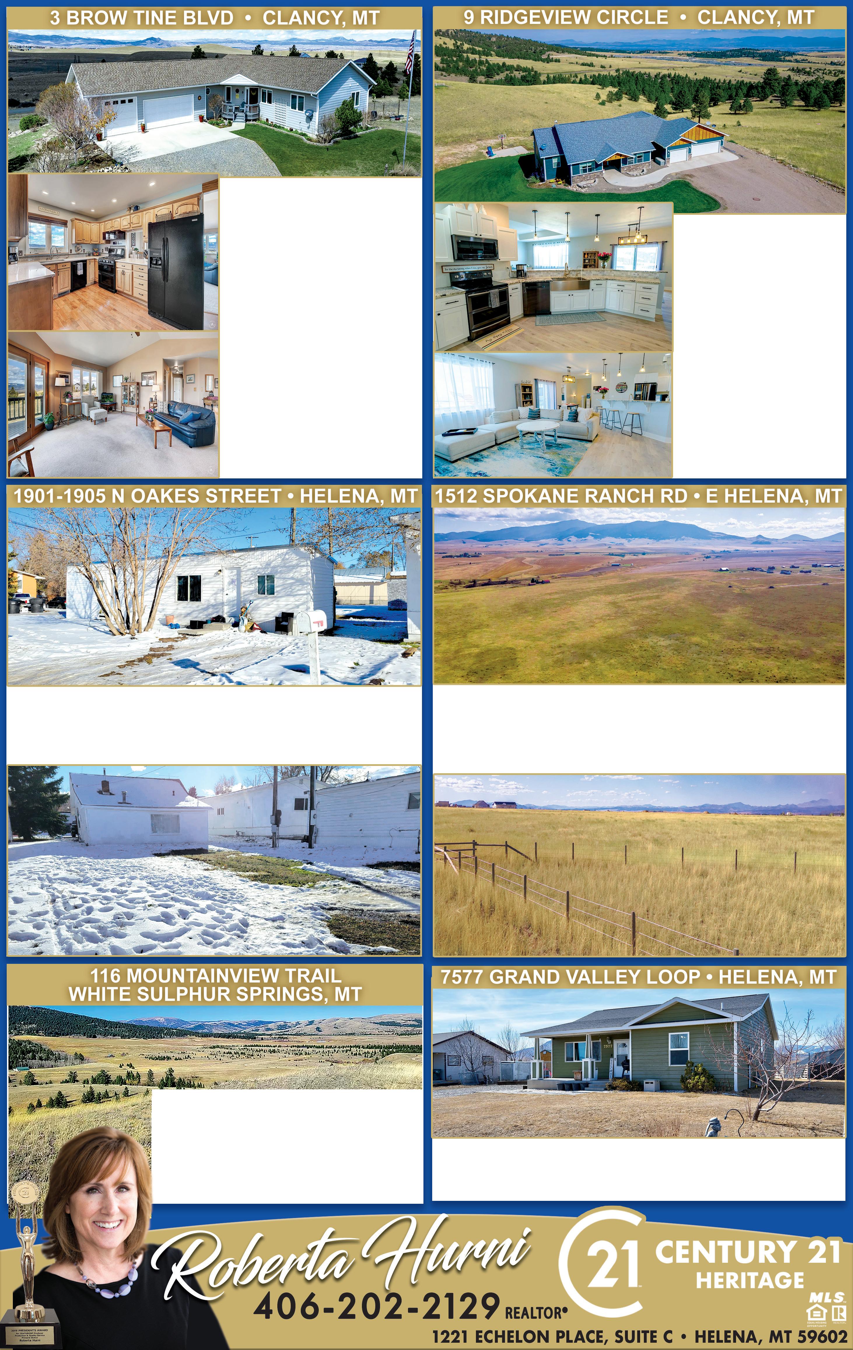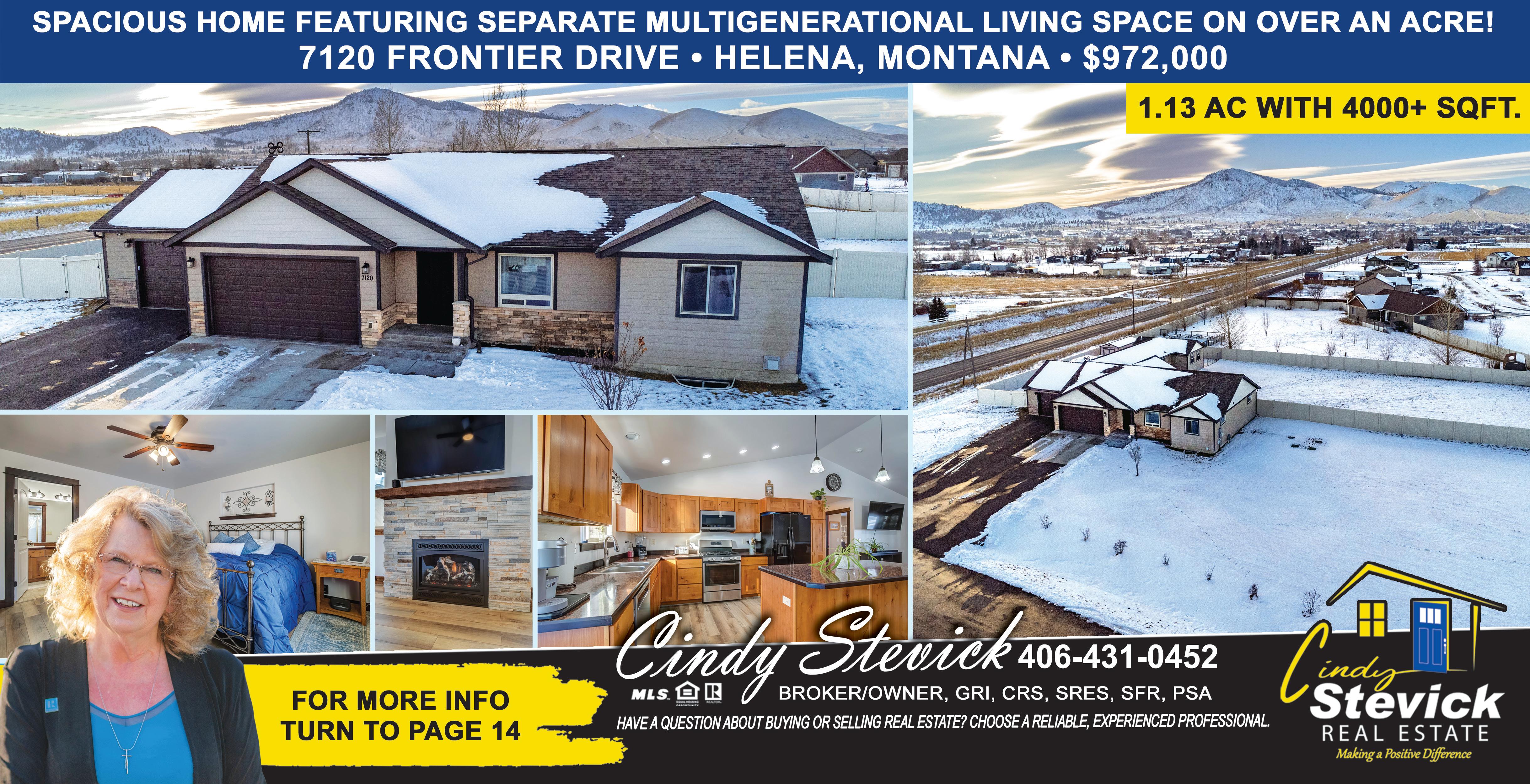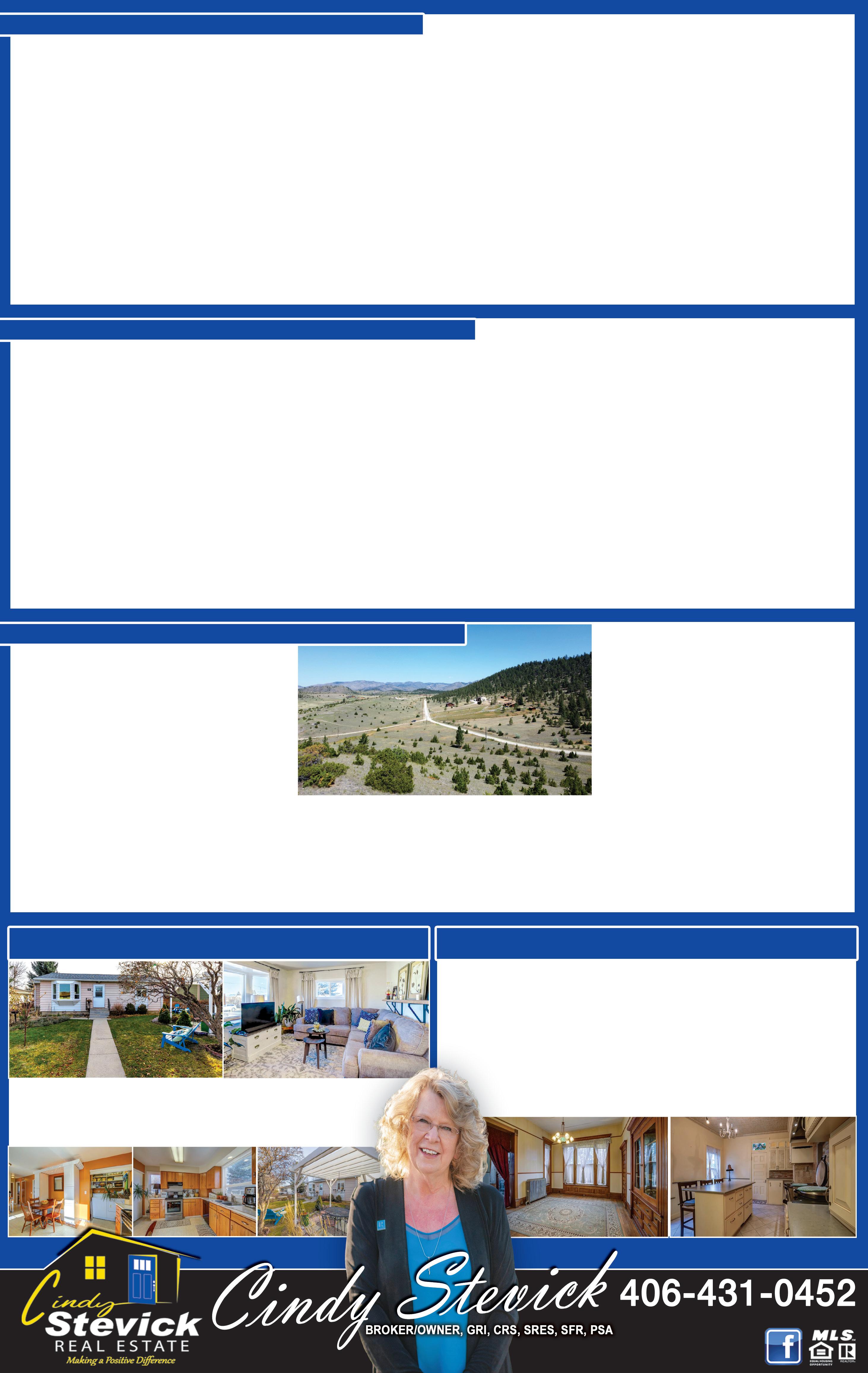 pg.7 www.CapitalRealEstateConnection.com Cindy@CindyStevickRealEstate.com www.CindyStevickRealEstate.com 7090 CRAIGLE LANE • HELENA, MT • $250,000 • MLS#30011355 Less than 20 mi from Helena, near both Hauser & Holter Lakes. Add the luxury of Eldorado Heights’ private boat launch on the shore of Hauser Lake & you’ve got a dream come true! Did we mention the private 200 acres for sapphire mining that is ONLY available to Eldorado Heights land owners? Subdivision is almost entirely surrounded by Forest Service & BLM land. Power is on the property. See more photos, plat, documents & MT DNRC’s well production chart for the subdivision at www.7090CraigleLaneHelena.com VINTAGE QUEEN ANNE VICTORIAN 1701 CANNON ST • HELENA, MT • $500,000 • MLS#30011939 Historical Value Built in 1885, Amazing Craftmanship • Original Woodwork & Dramatic Staircase • Some Original Hard Wood Flooring • Remodeled Kitchen & Main Floor ½ Bath Incredible AGA Cooker and Custom Kitchen Cabinetry • 3 Beds, 2.5 Baths 2600 SF, 4 City Lots • Additional Space in Basement & Unfinished 3rd floor 4 FINCH GULCH WAY • BOULDER, MT • MLS#30018762 • $400,000 20 ACRES! • 1920 SF, 3 bed(+office), 2 bath home on 8.44 Acres • 2018 structure w/ 2 sheds, chicken coup & well house • Located 10.3 miles south of Boulder along HWY 69 • This spacious home is unfinished but has good intentions! • (Co-listed with Michelle Haverstick, Gallatin Realty Group, 406-570-5422) NESTLED BETWEEN BULL MOUNTAINS TO THE WEST & THE ELKHORN MOUNTAINS TO THE EAST 7120 FRONTIER DRIVE • HELENA, MT • NOW $972,000 • 1.13 acres with 4000+ Sq Ft • Built in 2013, with addition in 2021 • Main House: 5 bed 3 bath with large office • Open concept living space, separate master suite • Addition: 1 bed 1 bath featuring full kitchen, gas fireplace, laundry, tiled shower, walk-in closet • Shared patio brings the living spaces together • Fenced backyard, RV parking with electrical • Generator switches for both living spaces www.7120FrontierDriveHelena.com SPACIOUS HOME FEATURING SEPARATE MULTIGENERATIONAL LIVING SPACE ON OVER AN ACRE! LOCATED IN HELENA’S BEST KEPT SECRET: “ The Tree Streets” 909 ORANGE AVENUE • HELENA, MT • $358,111 2 Bedrooms, 1 Bath, 920 SF Home, Built in 1959 on a 6250 SF Lot Refinished original hardwood floors • Amazing garden beds perfect for growing our own flowers, herbs & veggies • Close proximity to shopping, restaurants, exits to Interstate, & airport • Park Systems are easily accessible • WEBSITE: www.909OrangeAvenueHelena.com PRICE IMPROVEMENT! SOLD! SOLD! THE POSSIBILITIES ARE ALL RIGHT HERE! • BUILD YOUR DREAM HOME ON HILLTOP, HILLSIDE OR MEADOW • BEAUTIFUL PARCEL OF LAND • TUCKED AWAY YET EASY TO ACCESS! CLOSING SOON
