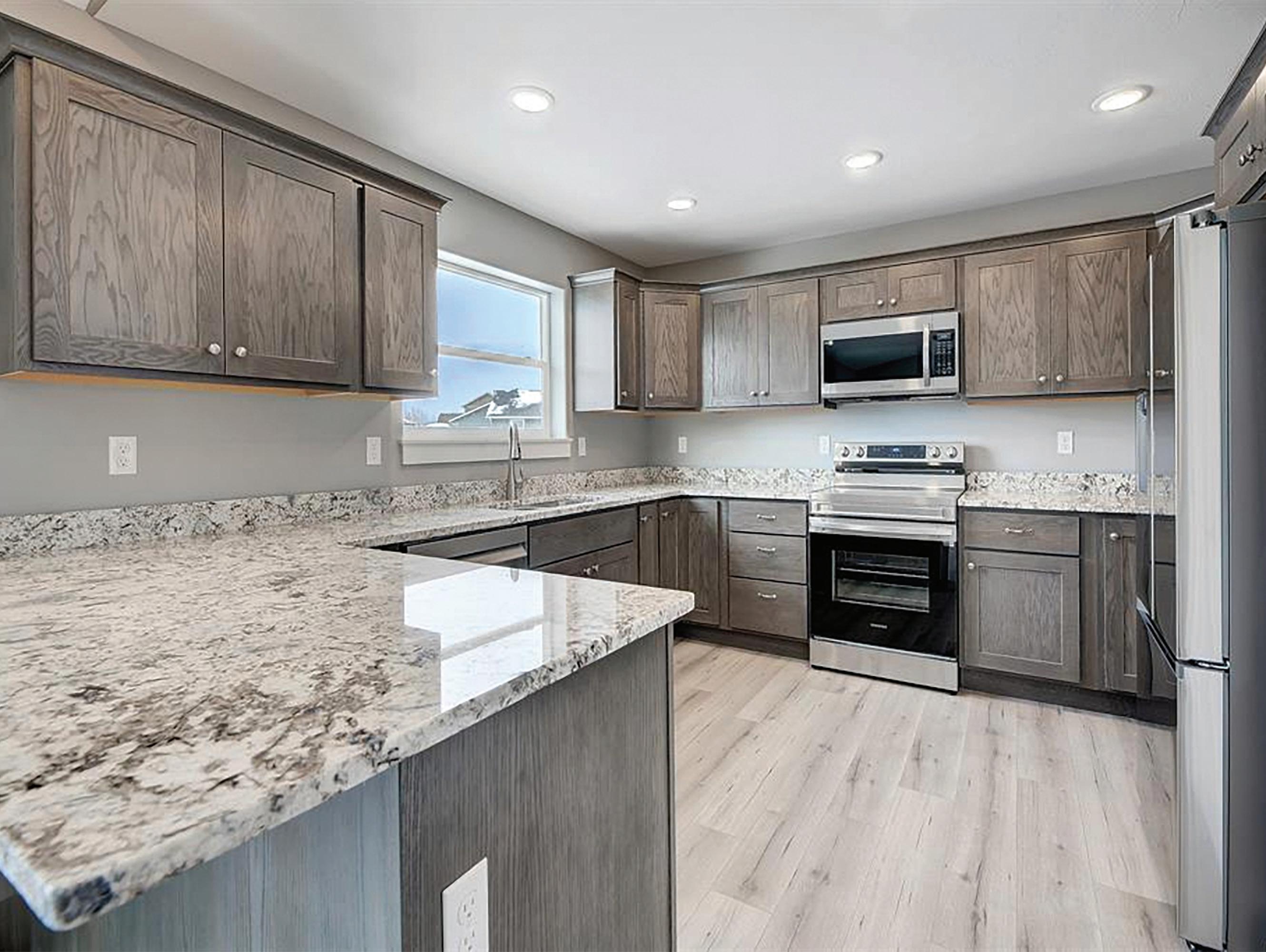 The kitchen includes granite countertops, beautiful cabinetry, stainless steel appliances, and a breakfast bar.