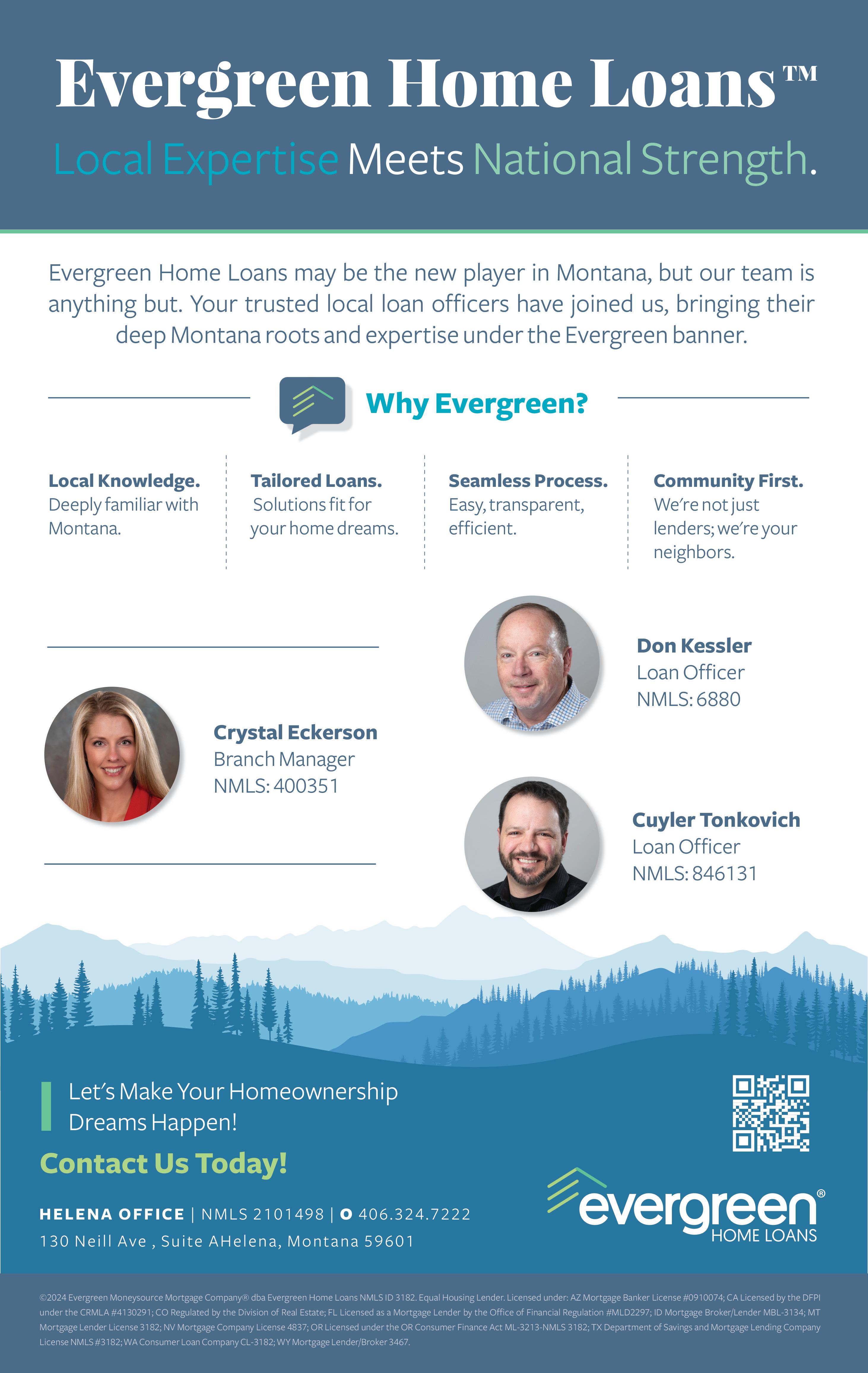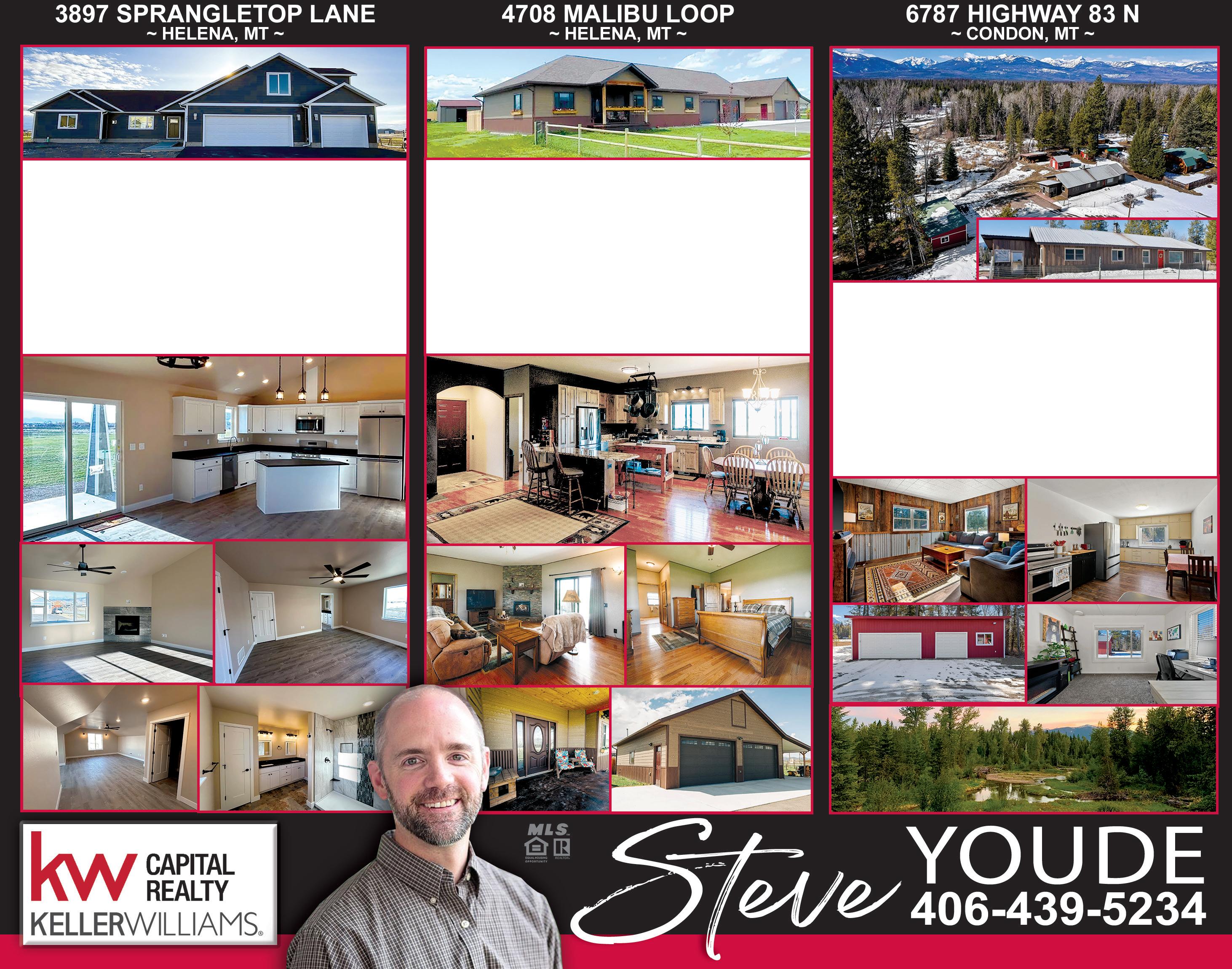 pg.3 www.CapitalRealEstateConnection.com BEAUTIFUL, SPACIOUS, FINISHED NEW CONSTRUCTION HOME WITH IMMACULATE VIEWS. Listing photos are of 2 similar homes with same floor plan completed in 2022 & 2023. Brand new 4 bed, 2.5 bath home on a large lot with thoughtful floor plan, high-end finishes, tiled bathrooms, gas fireplace, uniform lighting, granite counters, & spacious master bedroom. The views from the back patio are immense. Constructed by a builder who is known for his attention to detail, quality work, & dependable follow through. Don’t miss this Quality BuIlt, Beautiful Home. $709,000 - MLS#30018555 LUXURY LIVING NEAR HAUSER LAKE w/custom 3 bed, 2 bath single level home, att heated garage & shop on 2.5 acres. Lake Views. Close to boat launches & public land. 9-ft ceilings in home & 10-ft in garage. Beautifully-designed master suite w/walk-in shower. No expense was spared on counters, cabinets, & hard-wood flooring. Perfectly view the lake from front porch, back patio has plenty of space to sit around the fire. The 1200 SF shop is finished, w/heated 1/2 bath, attic storage & carport. Room for your toys & pets in the fenced yard. Back yard has new privacy fence. Minutes from 4 different lakes. $839,000 - MLS#30021022 ENCHANTING PROPERTY ENCOMPASSING 11 ACRES accompanied by a charming turnkey 1820 SF, 3 bed, 1 bath home built in 1957. Indoors, the ambiance is inviting w/ warm wood accents & abundant natural light. For storage & hobbies, a detached garage & shop await, while 2 quaint cabins provide extra space. The Swan River & the picturesque Seeley/Swan Valley offer endless opportunities for outdoor adventures. Fishing, hunting, hiking, & backcountry skiing. Nearby lakes & Bob Marshall Wilderness beckon exploration. Don’t let this slice of Montana paradise slip away! $695,000 - MLS#390378 https://SYoude.KW.com • SYoude@kw.com WELCOME TO 8545 EAGLE VIEW ROAD IN COVETED CANYON FERRY CROSSING SUBDIVISION! The 5 acre property is seeking new ownership where your Montana dream home could be built. Perched on top of a plateau is an ideal home building site. From here, the lot captures exceptional views of surrounding mountain ranges, Magpie Gulch & Canyon Ferry Lake. The building site is truly remarkable & makes you feel like you are on top of the world w/views for miles! The lot is easily accessible year-round by a dirt road & is only minutes away from State Land, Canyon Ferry Lake & endless outdoor recreational opportunities. Not only is the lot situated close to outdoor adventures, but the state capital, Helena, is approx a 30 min drive where you have access to grocery stores, restaurants, schools, shopping & parks. COME TOUR TODAY WHILE STILL AVAILABLE! HTTPS:// B OBBY G OODMAN R EAL E STATE .COM Bobby.Goodman@windermere.com