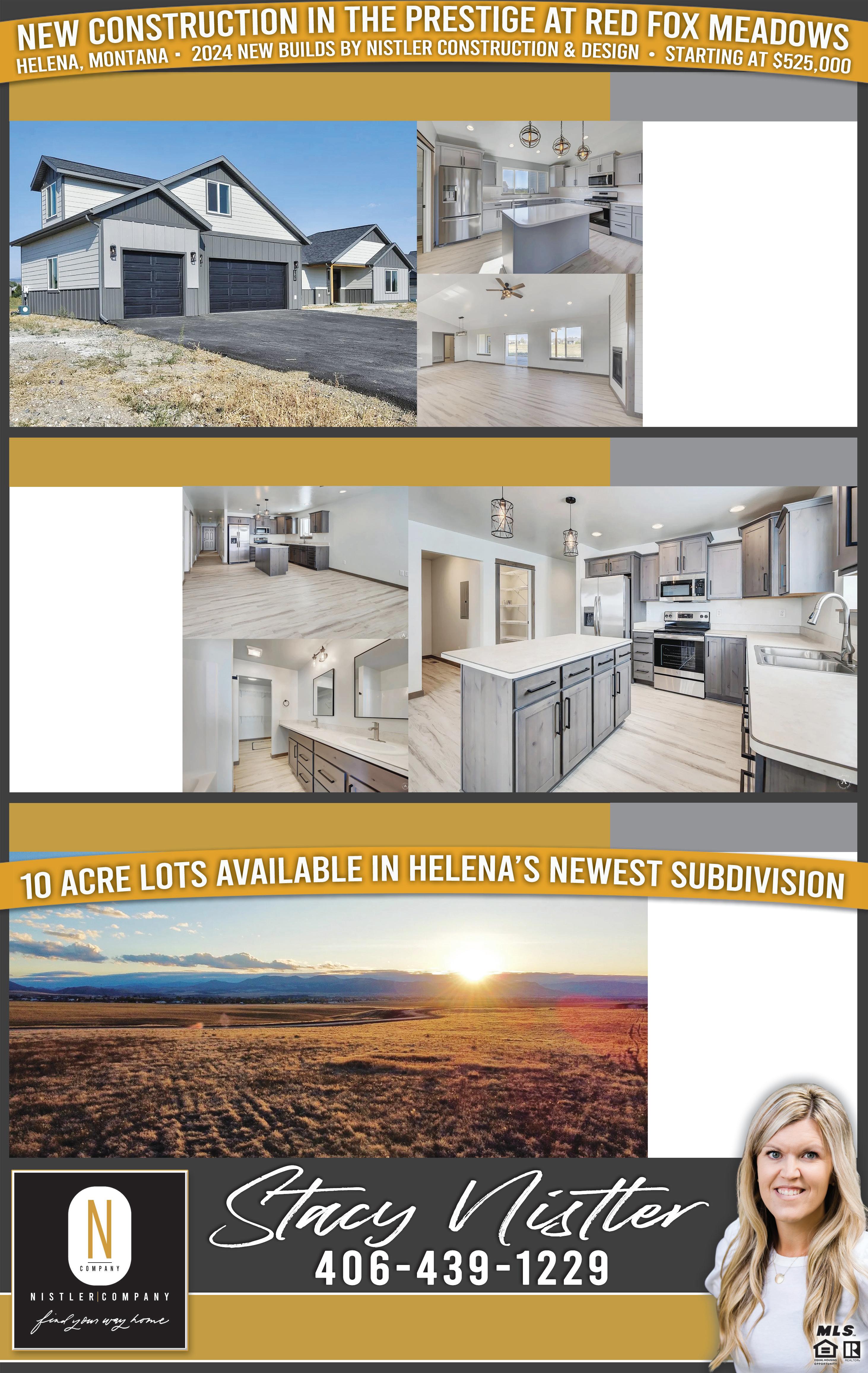 pg.15 www.CapitalRealEstateConnection.com stacy@nistlercompany.com www. n istler c ompany .com 3879 m usselshell r oad - e ast h elena, mt $644,900 - mls#30020436 Welcome home to the Large Miller at The Prestige in Red Fox Meadows!! The center of the popular Red Fox Meadows Subdivision features, The Prestige. NCD’s Large Miller plan features 4 beds 3 baths total. 2 ensuites, one on each level. This airy, open floorplan boasts ample natural light through large windows & plenty of room to entertain w/seamless flow. Situated on a 1/2-acre lot, this home offers ample space for outdoor activities. Upgrade options are available! Model home available for viewing. Estimated completion is June 2024. The photos are not of actual house but of actual floorplan. Seller is related to listing agent. 4035 h alle c ourt u nit a - e ast h elena, mt $325,000 - mls#30019137 2885 c allaway d rive - e ast h elena, mt $265,000 - mls#30016094 3 bed, 2 bath, single-level condo w/open floor plan, ample light & modern amenities. Includes a fully landscaped yard & backs up to meadows & picturesque mountain views. There are upgrade options available on this NCD build. Amenities included are waterproof LVT flooring, custom cabinetry, pine trim, pantry, & includes a modern color palette. Upgrade options available! Estimated completion May 2024.Condos available starting at $325,000. This stunning 10 acre lot is located in Scenic Vistas, Helena’s newest subdivision situated between 2 of the most sought after locations, Canyon Ridge & Red Fox Meadows. Boasting breathtaking mountain vistas & just moments from town, this makes the perfect location to build your dream home while still relishing the tranquility of nature. Seller is related to listing agent. under contract