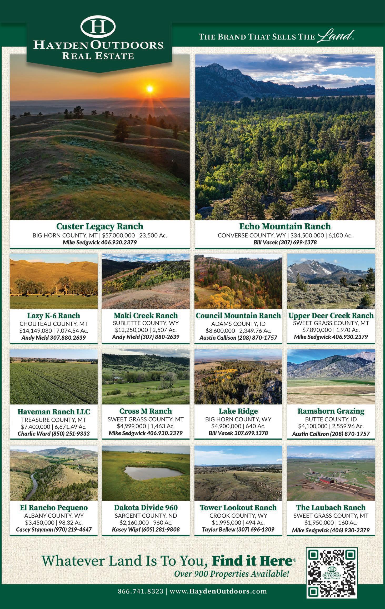 Hay Creek Ranch is a 6,800± acre working cattle operation located 10 miles south of Ismay, MT. The ranch consists of 6,079 deeded acres, 640 State lease, and 80 BLM, all in one contiguous block of well-watered grass pastures with pipelines, reservoirs, and a large spring. With 1,100± acres of hay ground, it supports 230 animal units and could run an additional 50–75 if supplementary fed. Key improvements include a large log home and secondary home, two greenhouses, calving and shop facilities, and good fencing. Hunting opportunities for mule deer, antelope, turkey, upland birds, and the occasional elk round out this $8,995,000 offering. PRICE: $8,995,000 Call Dru 406-772-5425
