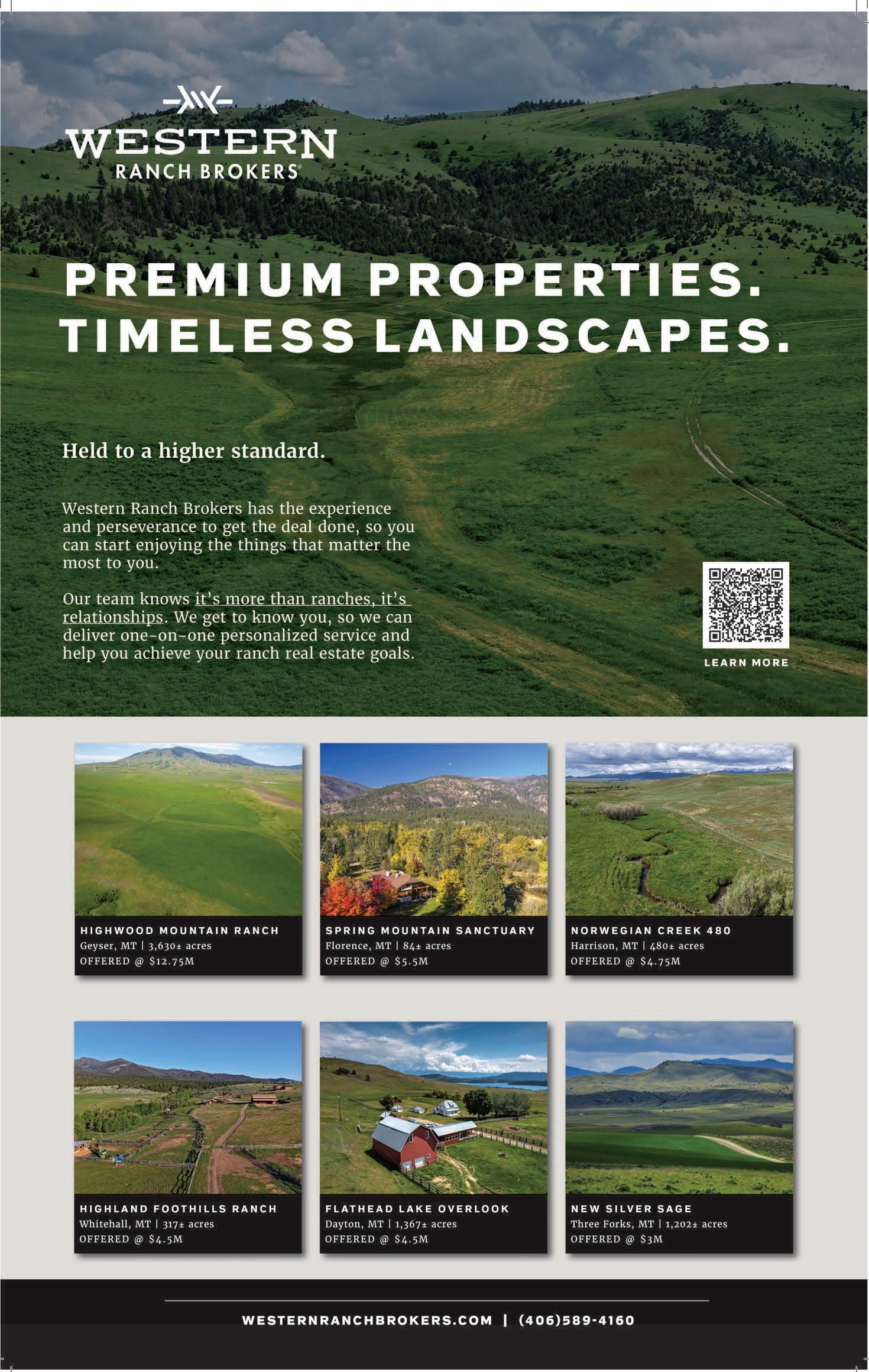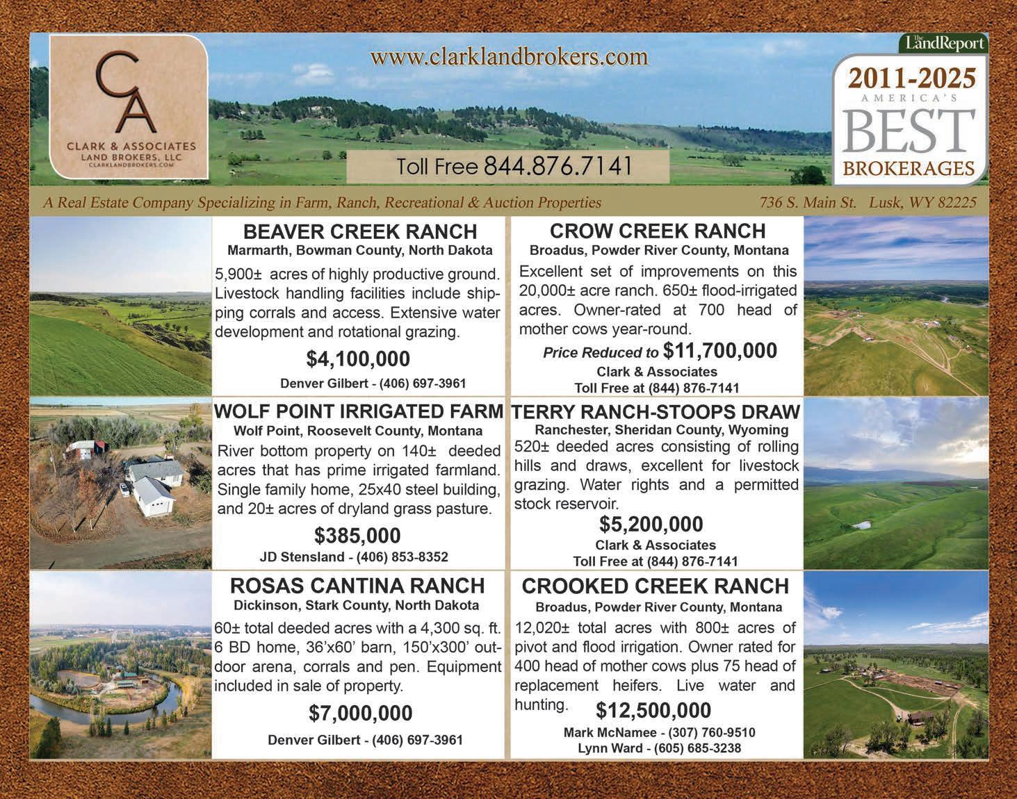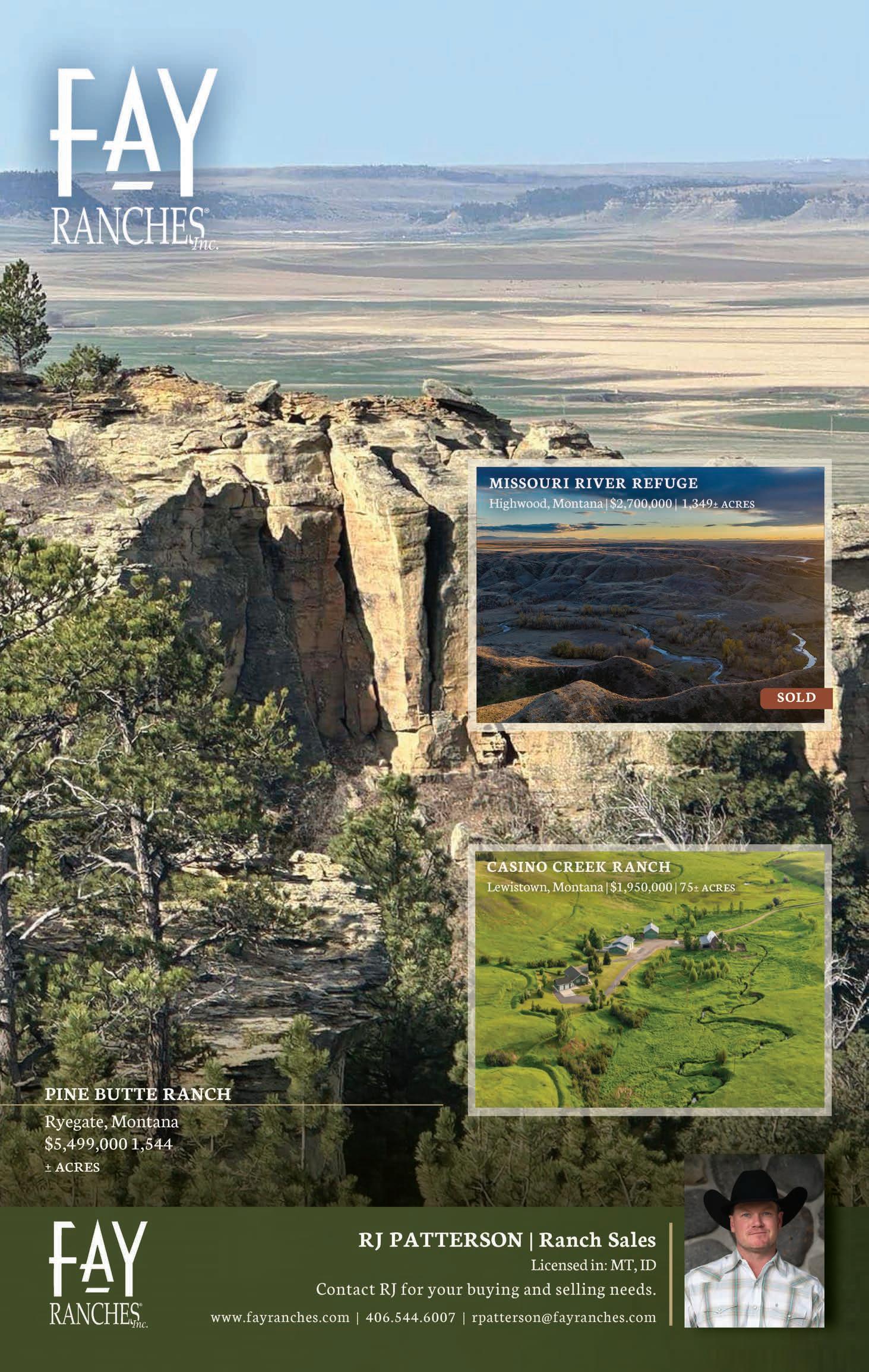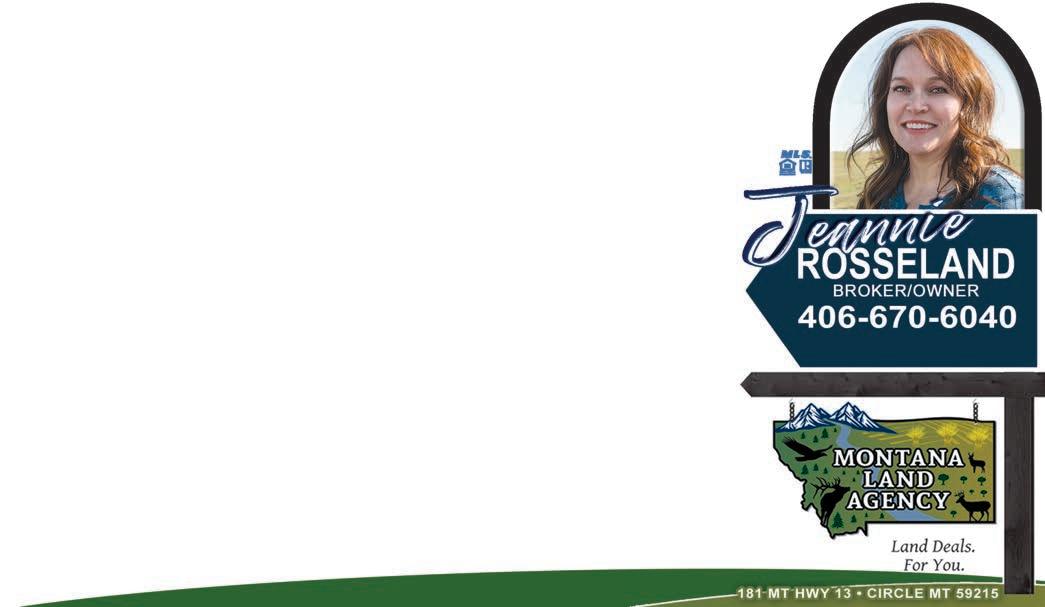 corrals. The corrals are plank on ties w/several lg holding pens, sorting alley & loading chute. They have run 660 pairs most years. LITTLE ROSIE RANCH • JORDAN, MT • $3,000,000 The Little Rosie Ranch is located one hour west of Jordan MT in Garfield County. 3,228+/deeded ac of rolling grass hills & draws w/a 3,915+/- ac, 793 aum, BLM allotment that borders over 60,000 ac of BLM & State land that eventually leads to the Charles M. Russell National Wildlife Refuge. There are 510+/- farmland ac & 40 ac of dike flooded hay ground that is fairly productive. Pastures are crossed fenced for rotational grazing & feeding in the winter. One electric well runs a pipeline through the whole ranch that runs 6 water tanks, 4 in the deeded ac & 2 in the BLM allotment all in good working condition. Pipeline water is supplemented w/5 reservoirs. Owner estimates the stocking rate at 150 to 200 AU’s yearround. Included are 2 small buildings, one being a bunkhouse & a shower house. The ranch is also equipped w/a heavy duty set of steel corrals. This is a hunters paradise located in the 700 district which has trophy Bull Elk & Mule Deer.