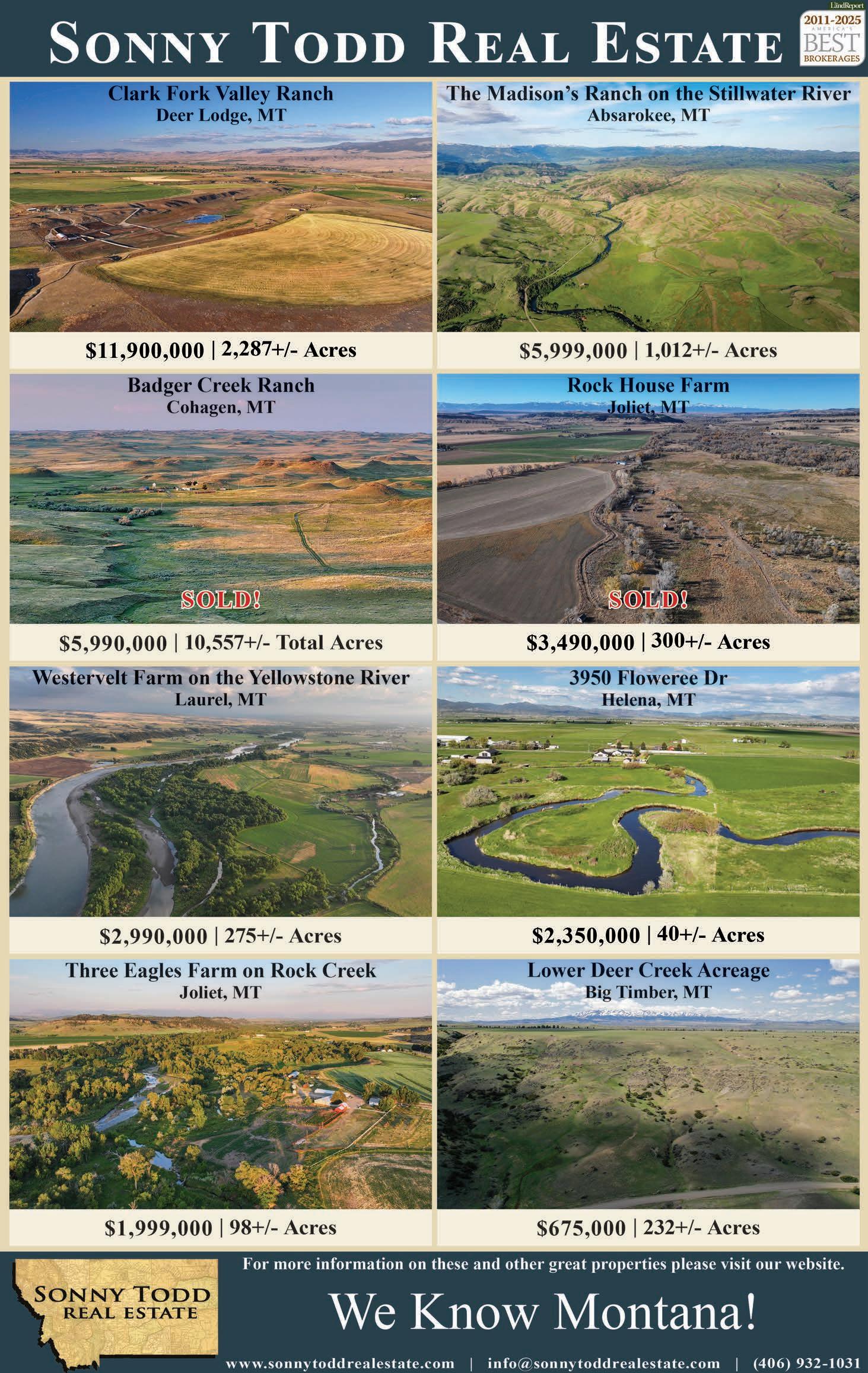 Montana Ranch for Sale! Encompassing 2,958 deeded ac, teaming with numerous species from small game to big game. The property & its surrounding area are renowned for trophy elk, mule deer, turkey, & bear in the ponderosa hills, as well as elk, whitetail deer, turkey, pheasant, & waterfowl in the irrigated ground/river bottom. Finding a property w/such a diverse population of huntable species within an hour of a commercial airport is rare nowadays. Located downstream of Billings, MT, w/roughly 1.5 miles of frontage along the banks of the Yellowstone River & almost 2.5 miles of creek, Hunters Paradise on the Yellowstone is a buffet for a recreational buyer. The ranch is currently managed as a cow-calf operation, a ranch that has remained fairly unchanged for over 100 years. PRICE: $7,900,000 Call Hyatt 406-402-0555