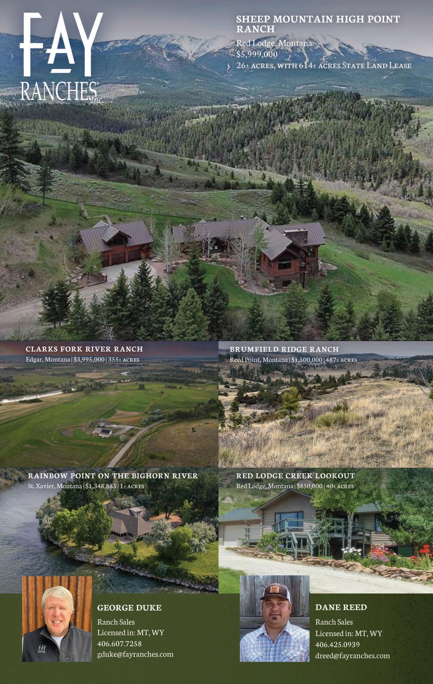 13,453-acre Montana ranch for sale with a 2,288 sq ft log home overlooking Buffalo Creek. Includes hay fields, a 10-acre spring-fed trout reservoir, multiple homes/cabins, and excellent water. Habitat supports year-round trophy elk, deer, and antelope — ideal for hunting, fishing, ranching, or recreation. $26,500,000 - MLS#25008-005053