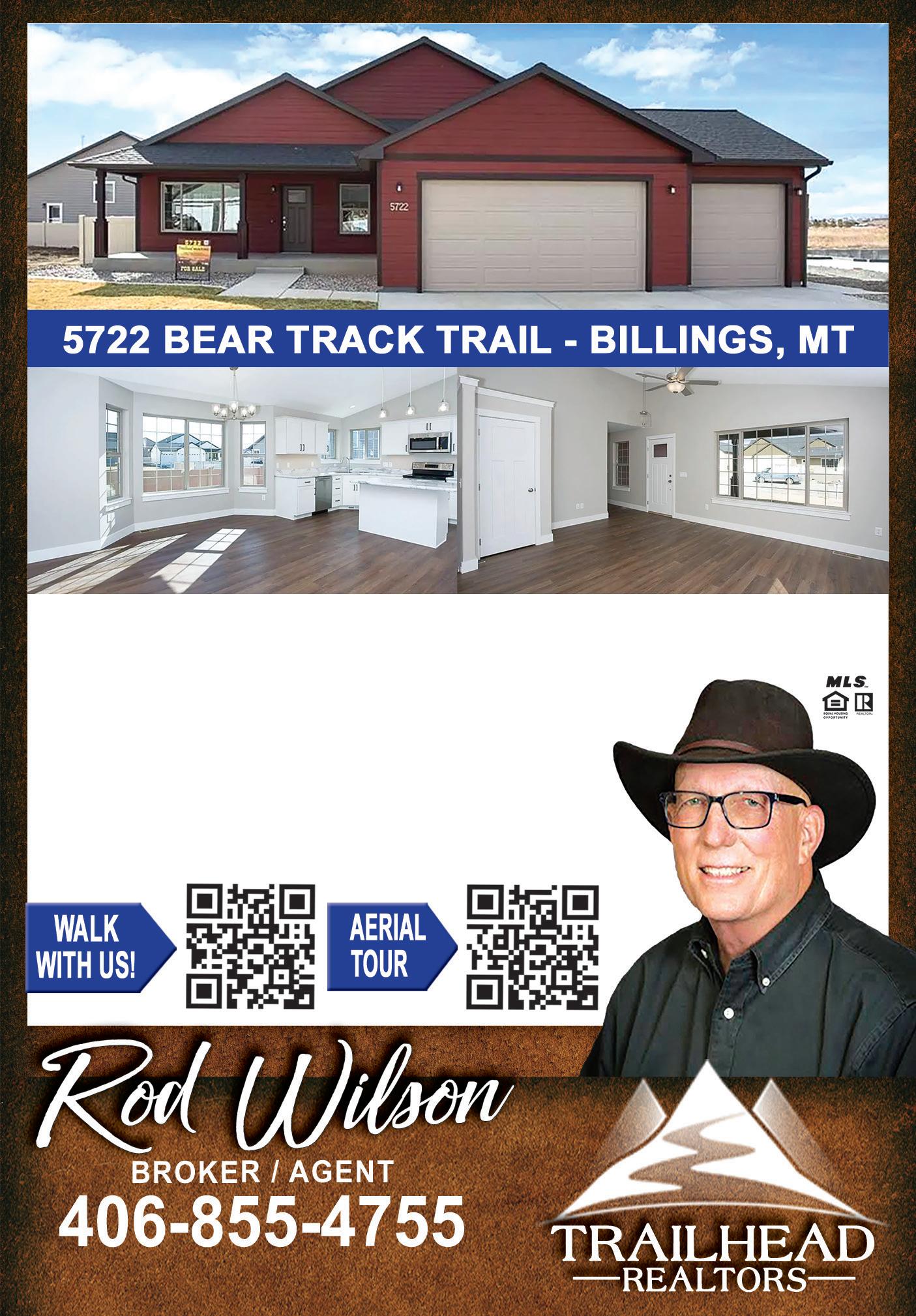 RE AL E S TATEPortfolio Portfolio weekly PG. 2 www.BillingsRealEstate.org www.TRAILSWESTBILLINGS.com ROD@TRAILSWESTBILLINGS.COM The subdivision is designed to create a calming effect which includes sidewalks, 5 feet from the curb and landscaped boulevard, front porches on every home, & walking paths throughout. • Plans Range From 1,500 SF to 3,200 SF • Offering One-Levels, 2 Story & Tri-Level Homes • 5 Homes Always Under Construction • Start A New Home Every 3 Weeks • Been Building For 12 Years • Come See Us At Our Model Home & Information Center ~ Located At 902 Grouse Berry - Billings, MT • Open 5 Days A Week • MONDAY - FRIDAY • 10- 4pm Our team would consider it an honor to serve you and assist you in becoming a resident of this vibrant community. APPOINTMENTS AVAILABLE EVERYDAY ~ MONDAY THROUGH SUNDAY ~ CALL 406-855-4755 FOR APPOINTMENT BILLINGS IS A SPECIAL PLACE TO LIVE, WORK & PLAY! 5722, 5723, & 5727 BEAR TRACK TRAIL - BILLINGS, MT FOLLOW THE SIGNS OFF STOCKMAN AVE. ~ THE MONTANA ADVENTURE AWAITS! ~