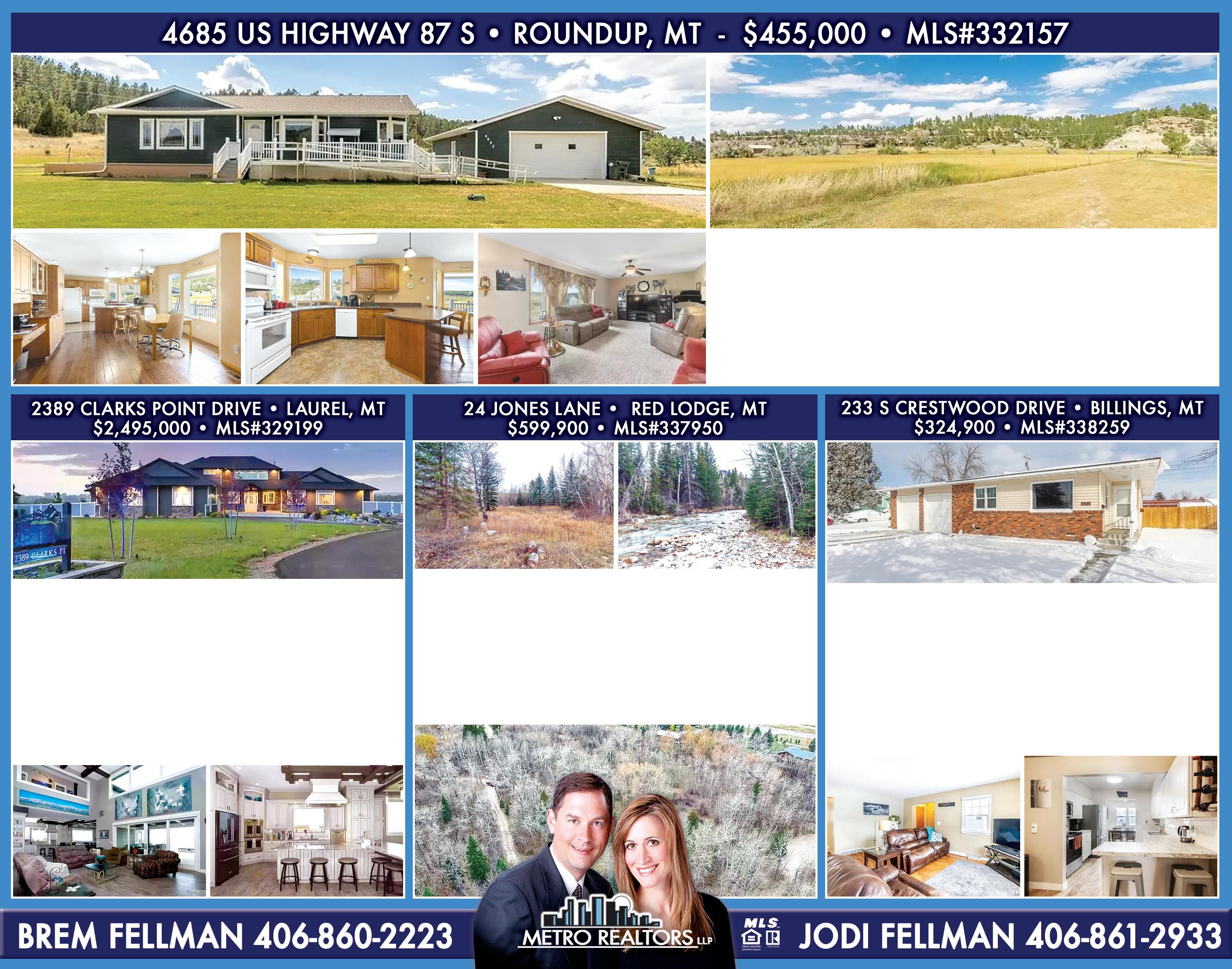 PG. 19 RE AL E S TATEPortfolio weekly www.BillingsRealEstate.org BLUE CREEK LAND BILLINGS, MT 1.08 AC • MLS# 328769 • $30,000 1.03 AC • MLS# 328767 • $35,000 1.43 AC • MLS# 328773 • $48,000 1.32 AC • MLS# 328778 • $45,000 2.7 AC • MLS# 328770 • $90,000 BRAD WITTEN 406-698-3829 CENTER ROAD HARDIN, MT 6.36 AC EACH MLS# 332197 MLS# 332198 $59,900 EACH CLINT SCHULTZ 406-860-2703 BUCKSKIN RD ROUNDUP. MT 55 AC MLS#331378 $177,000 TAITE JOHNSON 307-680-7133 TRENT JOHNSON 307-680-0033 TBD MOUNTAIN VIEW RD MOLT / RAPELJE, MT 78.10 AC • MLS# 333591 TBD RAPELJE ROAD MOLT / RAPELJE, MT 76 AC • MLS# 333603 $180,000 EACH RACHEL COURT 406-794-9915 TAITE JOHNSON 307-680-7133 TRENT JOHNSON 307-680-0033 2140 & 2160 P R I C E D R O P P R I C E D R O P LOTS 1 & 2 MAMMOTH RD SHEPHERD. MT 10.11 AC EACH MLS#337606 & MLS#337607 $185,000 EACH CLINT SCHULTZ 406-860-2703 TBD SAPPHIRE AVENUE BILLINGS, MT $74,000 MIKE LESLIE 406-860-0262 www.Facebook.com /RedLodgeRealEstate 4524 CENTRAL AVE • BILLINGS, MT $7,560,000 MLS# 324668 MEGAN VADEN 406-696-8312 1520 HIGHWAY 384 HARDIN, MT $375,000 MLS# 328989 MIKE LESLIE 406-860-0262 918 N 32ND BILLINGS, MT $490,000 MLS# 337208 CLINT SCHULTZ 406-860-270 3 17 KING ARTHUR DR BILLINGS, MT $83,000 MLS# 337194 KALLI WESCOTT 406-850-7426 3027 70TH STREET W BILLINGS, MT $395,000 MLS# 337905 TARA CAYKO 406-672-6453 404 MAIN STREET WINIFRED, MT $79,000 MLS# 337185 CHANEY BOWEN 406-633-5479 2943 SPRINGFIELD AVE • BILLINGS, MT $289,900 MLS# 337521 MEGAN VADEN 406-696-8312 518 ANDRICK AVENUE BILLINGS, MT $124,900 MLS# 337117 CLINT SCHULTZ 406-860-2703 58 HORSESHOE TRAIL ROBERTS, MT $1,950,000 Ι MLS# 331613 MARNI ECHOLS-BELL 406-426-4382 21 WOLFE DRIVE RED LODGE, MT $699,900 Ι MLS# 337144 MARCELLA MANUEL 406-671-3790 509 N CUSTER AVENUE HARDIN, MT $139,900 MLS# 3337154 LINDSAY VANDERSLOOT 406-850-5225 501 S WORD AVENUE RED LODGE, MT $695,000 Ι MLS# 326783 KENNY JEANSONNE 406-818-9551 539 ANDRICK AVENUE BILLINGS, MT $84,900 MLS# 337105 CLINT SCHULTZ 406-860-2703 2203 E ECHO DRIVE BILLINGS, MT $459,000 MLS# 338427 RACHEL COURT 406-794-9915 87 EVENING STAR RED LODGE, MT $5,400,000 Ι MLS# 33146 MARCELLA MANUEL 406-671-3790 3014 ELDERBERRY AVENUE RED LODGE, MT $729,000 Ι MLS# 335477 MARCELLA MANUEL 406-671-3790 1409 SILVER CIRCLE RED LODGE, MT $529,000 Ι MLS# 338198 MARCELLA MANUEL 406-671-3790 P R I C E D R O P P R I C E D R O P P R I C E D R O P 64 ALPINE BASIN LOOP 3 BED • 3 BATH • 2,996 • SF 2 CAR GARAGE $899,900 Ι MLS# 337765 ALPINE BASIN TRAIL 3 BED • 2.5 BATH • 2,084 SF 2 CAR GARAGE $729,900 TO $739,900 MARCELLA MANUEL 406-671-3790 FOR MORE INFO: www.TimbersMT.com LAZY D RANCH LOT 9 BRIDGER, MT 15.11 ACRES MLS# 333567 $225,000 SKYLER KETOLA 406-290-4286 3D TOUR: https://tinyurl.com/4jvjcr87