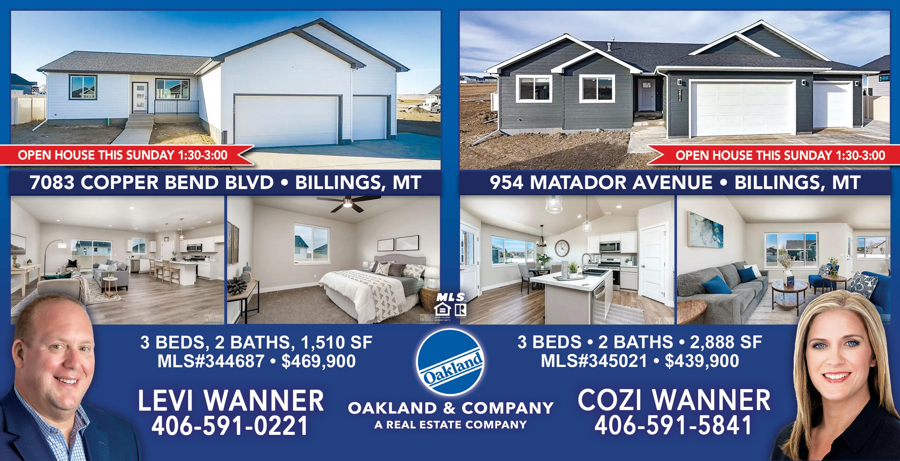 COPPER SUNSET DR BILLINGS, MT OPEN SUNDAY 12:00PM-4:00PM AREA 8 4 Beds, 3 Baths, 2,752 SQFT. $529,900 – MLS#343958 CHARITY DIAMOND 406-839-4946 WILLIAMS HOMES, INC. 280 WIND CAVE CIR BILLINGS, MT OPEN SUNDAY 1:00-3:00PM AREA 8 3 Beds, 3.5 Baths, 2,132 SQFT. $449,500 – MLS#344238 RYAN AUER 406-850-2011 SHERI AUER 406-661-3355 RED TRUCK RE 5420 CANVASBACK DR BILLINGS, MT OPEN SUNDAY 1:00-3:00PM AREA 8 3 Beds, 3.5 Baths, 2,821 SQFT. $1,199,000 – MLS#343328 DANA WAGENHALS 406-671-1441 REAL ESTATE HUB 7608 WOOD DUCK CIR BILLINGS, MT DRIVE BY – AREA 8 3 Beds, 2 Baths, 2,042 SQFT. $800,000 – MLS#344761 BRENDY PATTERSON 406-281-0144 EXP REALTY 865 PAINTBRUSH PL BILLINGS, MT DRIVE BY – AREA 8 6 Beds, 4.5+ Baths, 8,307 SQFT. $1,500,000 – MLS#342736 CHRIS DUNN 406-698-3531 MONTANA RE BROKERS LOT 4, BLK 4, GRESHAM SUBD BILLINGS, MT DRIVE BY – AREA 8 3 Beds, 2 Baths, 2,200 SQFT. $688,000 – MLS#342550 CHRIS DUNN 406-698-3531 MONTANA RE BROKERS 12 WOODGRAIN DR BILLINGS, MT DRIVE BY – AREA 8 3 Beds, 2 Baths, 1,206 SQFT. $42,500 – MLS#343822 DANNY BALL 406-672-0465 ON THE BALL REALTY LLC 3265 TAHOE DR BILLINGS, MT DRIVE BY – AREA 8 3 Beds, 3 Baths, 2,272 SQFT. $389,000 – MLS#344351 FROSTY ERBEN 406-855-8900 KELLER WILLIAMS YP https://www.bakertransferandstorage.com/ OPEN HOUSES & DRIVE BUYS! TM MAPS & POSTED ON FACEBOOK! WeeklyRealEstatePortfolio groups/montanaforsale www.BillingsRealEstate.org rimadvertisingmt check us out online! online! FACEBOOK: INSTAGRAM: WEBSITE: like our pages! our pages! AREA 8 – WEST BILLINGS AREA 1 – BILLINGS HEIGHTS – GOVERNORS AREA 7 – NORTHWEST BILLINGS AREA 5 – BLUE CREEK/DUCK CREEK AREA 6 – DOWNTOWN BILLINGS Beautifully built in 2019, this residence is nestled on an expansive double fenced lot conveniently close to downtown. This 2,088 SF single-level ranch style home shows pride of ownership, w/numerous upgrades throughout. The spacious master suite features a generous walk-in closet & additional storage room. Open-concept living room, kitchen, & dining area w/vaulted ceilings. Enjoy the convenience of all city services, w/ fully landscaped grounds, fenced boundaries, & a well for irrigation. www.NancySellsMontana.com Nancy@curtissrealestate.com WWW.O AKLAND C OMPANIES .COM This new construction home is located in the High Sierra subdivision of the Billings Heights. Step through the front door to a bright open concept home that flows flawlessly. The main floor features the living room that opens to the kitchen w/plenty of storage, large corner panty, & designated dining space. The primary suite features a walk-in closet & private bath. The lower level is unfinished. 3 car garage. Photos of similar home. Fabulous new construction home located on the Billings Westend. 1-level open concept living, dining & kitchen area. The kitchen has plenty of storage w/large corner pantry & spacious island. The primary suite is private from the other bedrooms & consists of a private bath & walk-in closet w/custom built-ins. 2 beds & 1 bath are located across the home. The laundry/mud room leads to a massive 3 car garage! Fence included. Photos of similar home. OPEN HOUSE SUN 1:30-3:00 OPEN HOUSE SUN 1:30-3:00 Thanks to Our Many Friends for Making Our 2024 St. Patrick Day’s Bash a Success! AREA 3 – LOCKWOOD/EMERALD HILLS AREA 2 – BILLINGS HEIGHTS – BENCH