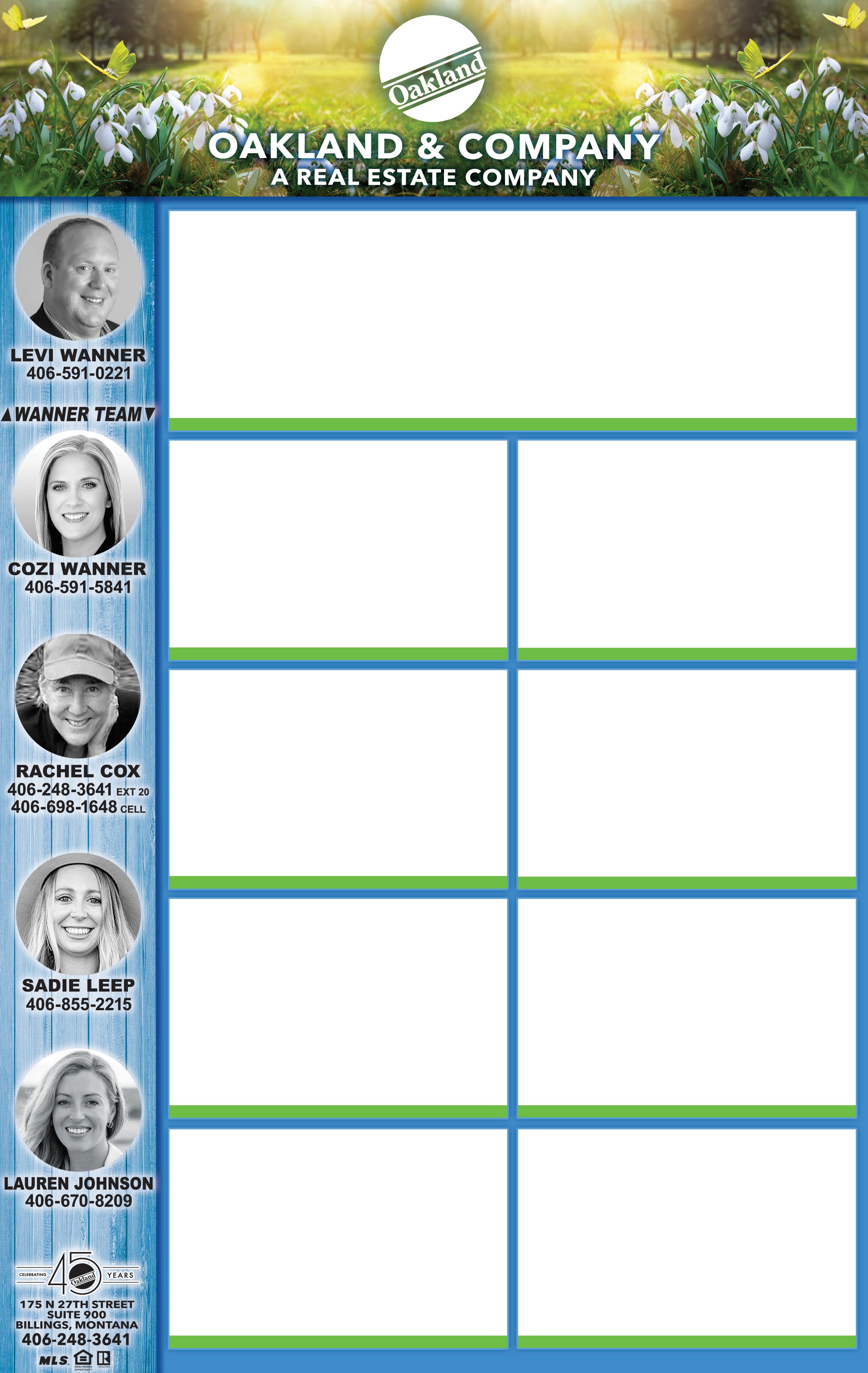 PG. 5 RE AL E S TATEPortfolio weekly www.BillingsRealEstate.org WWW. OAKLANDCOMPANIES .COM LWanner@oaklandcompanies.com CWanner@oaklandcompanies.com www.RachelCox.biz SadieLeepRealtor@gmail.com LJohnson@oaklandcompanies.com COZI WANNER 406-591-5841 OR LEVI WANNER 406-591-0221 954 MATADOR AVENUE • BILLINGS, MT • $439,900 3 BEDS • 2 BATHS • 2,888 SF • MLS#344036 COZI WANNER 406-591-5841 6539 FIRE ROCK DRIVE • BILLINGS, MT • $137,000 1.99 ACRE LOT • WEST-END LOCATION • MLS#343674 COZI WANNER 406-591-5841 COZI WANNER 406-591-5841 LAUREN JOHNSON 406-670-8209 2456 W BONITO LOOP • BILLINGS, MT • $489,900 3 BEDS • 2 BATHS • 2,202 SF • MLS#344618 2317 ENTRADA ROAD • BILLINGS, MT • $539,900 3 BEDS • 2 BATHS • 2,316 SF • UNFINISHED LOWER LEVEL • MLS#343880 7083 COPPER BEND BLVD • BILLINGS, MT • $469,900 3 BEDS • 2 BATHS • 1,510 SF • MLS#344687 COZI WANNER 406-591-5841 COZI WANNER 406-591-5841 NEW PRICE! COZI WANNER 406-591-5841 OR LEVI WANNER 406-591-0221 976 EL RANCHO DRIVE • BILLNGS, MT • $459,900 3 BEDS • 2 BATHS • 3,076 SF • MLS#343925 950 ANACAPA LANE • BILLNGS, MT • $339,900 3 BEDS • 2 BATHS • 1,372 SF • MLS#344929 LAUREN JOHNSON 406-670-8209 820 HERMOSA STREET • BILLINGS, MT • $369,900 3 BEDS • 2 BATHS • 1,356 SF • MLS#345024 LAUREN JOHNSON 406-670-8209 821 HERMOSA STREET • BILLINGS, MT • $369,900 3 BEDS • 2 BATHS • 1,361 SF • MLS#345025 CALL TO VIEW! CALL TO VIEW! CALL TO VIEW! OPEN HOUSE SUNDAY 1:30-3:00 OPEN HOUSE SUNDAY 1:30-3:00