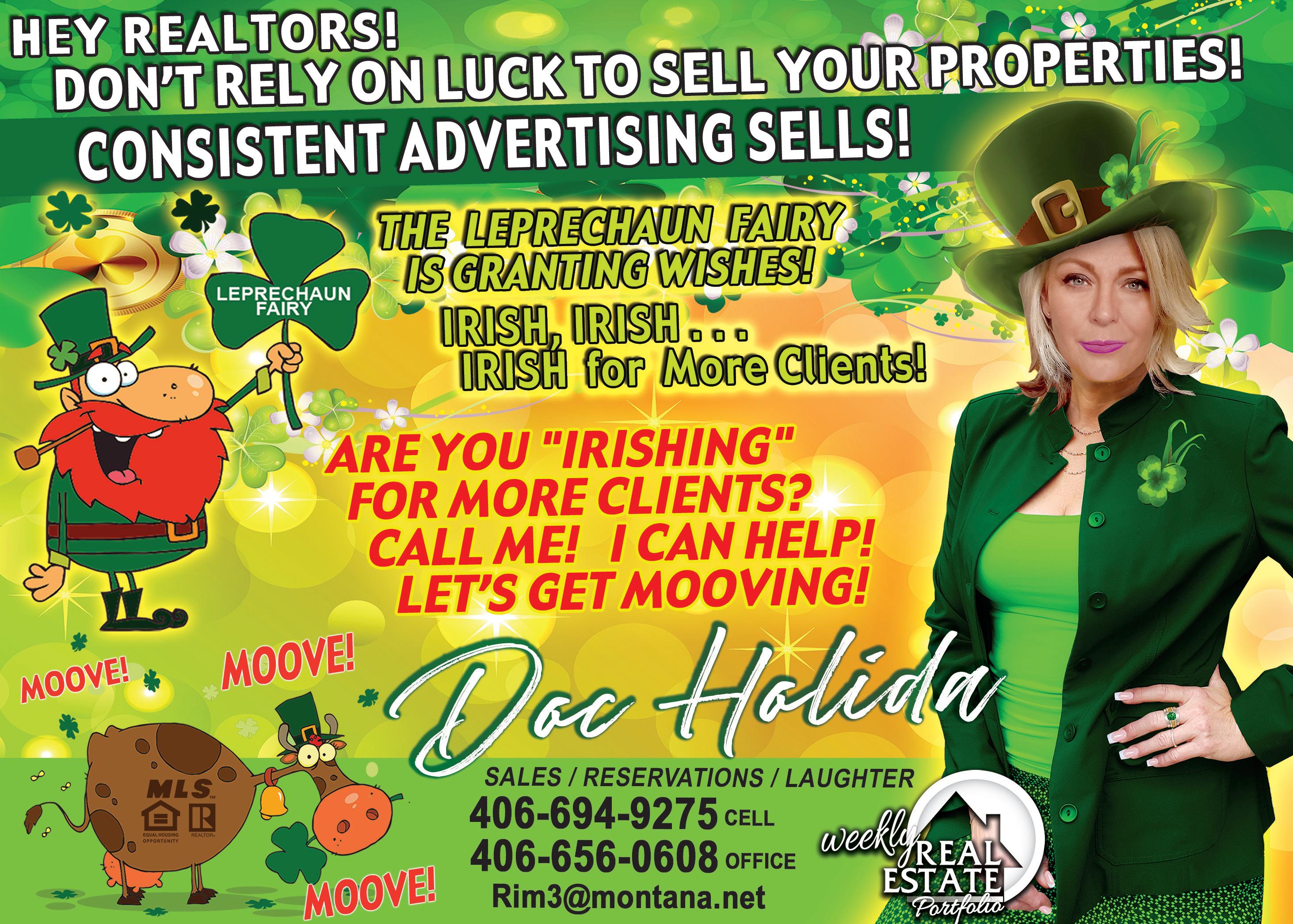 RE AL E S TATE POSTED TO OUR WEB SITE, FACEBLOOK PAGES & INSTAGRAM PAGE! CENTER SECTION FREE OPEN HOUSE LISTINGS! MAPPED ONLINE - Google™ MAPS FREE HappySt.Patrick's Day! HappySt.Patrick's Day! weekly Portfolio Portfolio SEE PAGES 10-11 TO VIEW MORE ON THESE HOMES! PUBLICATION OWNED BY: THE BILLINGS ASSOCIATION OF REALTORS® DESIGNED & PRODUCED BY: RIM ADVERTISING, INC. • 406-656-0608 • WWW.RIMADVERTISING.COM www.BillingsRealEstate.org www.instagram.com/rimadvertisingmt www.Facebook.com/WeeklyRealEstatePortfolio www.Facebook.com/groups/montanaforsale COMMERCIAL LISTINGS: www.MontanaCommercialRealEstate.com FARM & RANCH LISTINGS: www.MontanaFarmsAndRanches.com RESOURCE GUIDE: LEPRACHAUN WISHES p22 & 23 LOTS & LAND p8 SOCIAL MEDIA INFO p10 OPEN HOUSES p12-14 SPECIALISTS p16 COMMERCIAL INFO p18 MT FARMS & RANCHES INFO p 18 NEW LISTINGS p20 RACK LOCATIONS p24 MARCH 14 TH - 20 TH , 2024 VOL. 32 - NO. 11 ealty highsierra@williamshomes.com WWW.KIMBERLYEHRLICH.REALTOR | KESELLSMT@GMAIL.COM guildmortgage.com/sandywong sandy.wong@guildmortgage.net