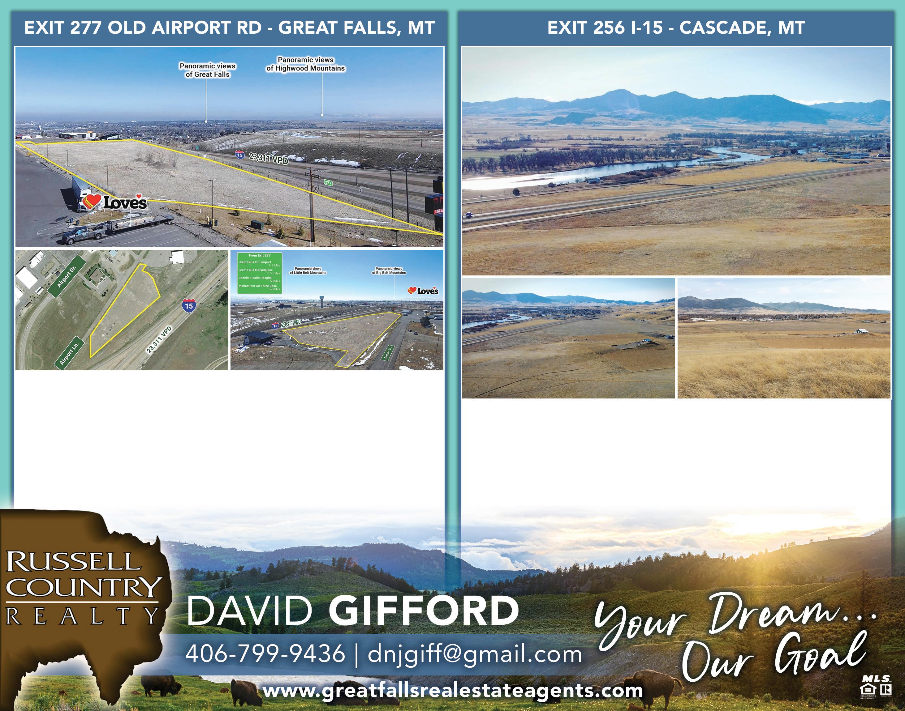 Calling all ENTREPRENEURS...Take a look at this BUSINESS OPPORTUNITY in the city of Cascade!!! Carry on the tradition of CASCADE MEAT PROCESSORS or BRING YOUR OWN BUSINESS PLAN. The Retail Space features cafe-style checkered flooring & plenty of space for tables & retail items. The office area boasts hardwood flooring w/ plenty of storage in the adjoining rooms. This 3,914 SF structure could accommodate 2 OR MORE SEPARATE BUSINESSES FOR RENTAL INCOME. Need room to expand?? The spacious lot has room for that as well. Property has 2 restrooms & a private shower. Price change due to a new roof(cost over $40,000). $415,000 - MLS#30014166 mtbestrobin@gmail.com | www.montanasbestrealty.com This outstanding building site has some of the best views in Great Falls & great exposure to the high traffic on I-15. With endless opportunities, & ease of access from car or plane, this Big Sky location is EVERYTHING & much more! Perched high on the hill, overlooking the city, this location offers panoramic views w/a backdrop of the Highwood Mnts & the Little Belt Mtns. Over 4 acres of county commercial zoned land close to the Great Falls Int’l Airport & an I-15 exit. This parcel has city services running right by it or to it & could be annexed into the city which would be a great piece for a hotel, restaurant, storage facility, convention center development or implement/truck sales. $2,500,000 - MLS#30021845 Direct I-15 Interchange location, well-located within 30 min of the Great Falls, this rare 112+ acre land opportunity w/over 4,000’ of I-15 & (Sun River Cascade Rd) hwy frontage, having high visibility w/average daily traffic count over 4,800 makes it an ideal property for commercial & residential development. The parcel is primarily flat on the southern boundary, w/a grade change to the north offering beautiful build sites w/commanding views of the Missouri River & Little Belt Mtn Range. This parcel is zoned Mixed Use-20 (MU-20). $7,000,000 - MLS#30016913