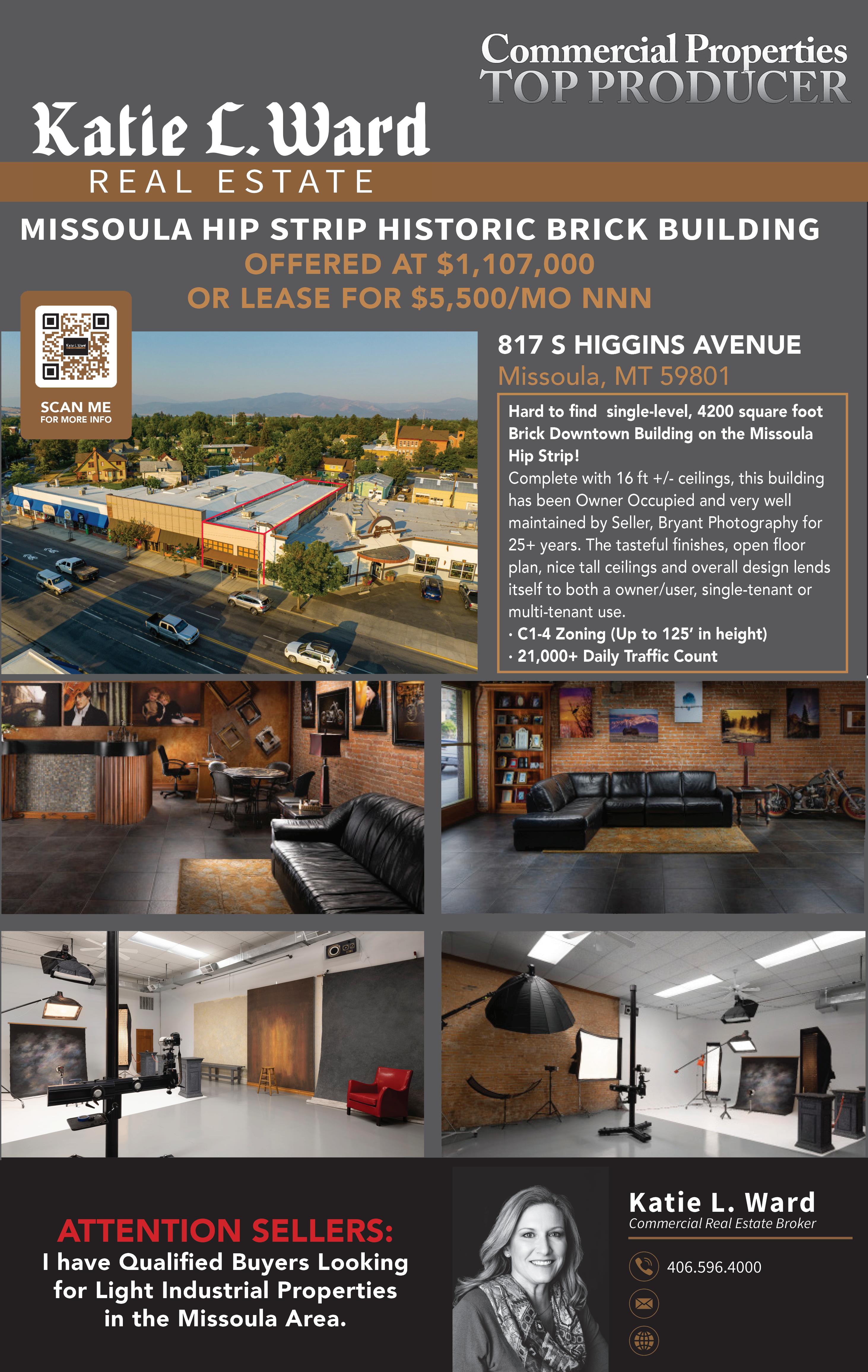 p 2 www.biz406.com Massive 5,000 SF open span building w/bare land to expand, subdivide, or build a residential home or another shop. Zoned for residential or commercial on 1.26± acres. Building has 2 baths, lg office, storage areas, & concrete floors. 220-wired & currently being used for manufacturing. Building is constructed for Alaska so heavily insulated w/structure to withstand snow. Located across the street of Eastside Hwy allows easy access & egress. Great opportunity for small manufacturing operation. Building is a blank slate. $995,000 - MLS#30010765 Rare Bitterroot river frontage. 20.01 ac w/East side along the river perfect for building. Lee Metcalf Wildlife refuge is across the river, keeping view unobstructed. Easy commute to Missoula & just a few miles from Stevensville. Extensive housing development work completed. $2,000,000 - MLS#30013667 Approx 164.63 ac w/5 parcels. East side borders HWY 93 for excellent commercial frontage w/daily traffic of approx 10,000 to 12,000 cars. Lg enough to accommodate lg store w/land left over for mini malls. Could accommodate single family homes w/commercial mix. $5,700,000MLS#30013670 Missoula downtown centrally located office building. Building is 2 stories of professional office space & a bsmt of multiple use storage. Entire building has been upgraded including a new HVAC system & a newer membrane roof. Level One is approximately 3,540 SF, Level Two is approximately 2,400 SF & the bsmt is also 2,400 SF. This is a rare find in Missoula perfect for retail or professional office space, close to everything in downtown Missoula. The outside of the building has unique architecture w/old brick. The building was built in 1910. Located in Pig Alley right behind the Top Hat, a couple buildings down from the Missoula Club & Rhinos. To view property we must have 24 hour notice & listing agents must attend all showings. $2,299,000 - MLS#30022316 This commercial lease opportunity offers easy access to amenities. The property spans 9.79 acres of customizable, fenced, & flat land. It provides flexible leasing options. The premises accommodate industrial equipment & semitruck turnaround, w/newly remodeled office building featuring nine offices, 3 bathrooms, & conference room. The 2nd level offers 10 offices, 5 baths, another conference room, & IT setup room. Tailored configurations to suit specific business needs. Don’t miss out on this prime commercial space. $35,000 - MLS#30020623 Alliance Truck & Tank Sales. This company operates as an intermediary in the field of propane storage, trucks, & equipment, serving as both a dealer & broker. Dealership agreements w/manufacturers specializing in residential storage tanks, bulk storage tanks, & propane delivery & service trucks. Sales of $8.3 million in 2022. Professional CPA analysis completed to establish asking price. Opportunity is for the business ONLY no building & land is included in the sale. $3,200,000 - MLS#30014921 The iconic River City Grill, nestled alongside one of the state’s busiest truck stops. Occupying the storied W.A. Clark building, a historic relic from the turn of the century, this establishment echoes the rich legacy of the Western Lumber Company’s headquarters. The lease comes w/substantial 9-year term w/potential for extended arrangements. Included is a City of Missoula Beer & Wine license (Non Gaming). This offering presents an exclusive opportunity to acquire the thriving business housed within this historic structure. Become a part of this vibrant community hub, where history meets modern hospitality. Secure your place at the heart of Bonner’s thriving culinary and communal landscape with River City Grill. $1,495,000 - MLS#30018273 This St. Regis Storage facility is located just outside of town. There are a total of 29 units that are all rented. There is also a small apartment attached to the storage building that could be used as an office. There is extra land w/ this facility for expansion. $450,000 - MLS#30011121 Retail/Light industrial along 93 & rare Bitterroot Riverfront residential land w/ideal Mixed-Use Development accommodating Single-Family homes along the river frontage w/commercial mix on hwy frontage. Traffic counts approx 10,000-12,000 cars per day on Hwy 93 frontage. Easy commute to Missoula & just a few miles from Stevensville. Includes 2 20-acre parcels. $4,000,000 - MLS#30013501 Garden City Monument Services has been in business since 1946. The owners of this business have decided to sell & are offering the business, inventory, equipment, client contacts plus training. This is a business opportunity only so the building & land are not included. $150,000 to $200,000 of inventory plus thousands of templates & designs & artwork from years of business. Strong financials & owners willing to help train for a certain amount of time. Currently in a State leased location. $299,900 - MLS#30012895 Rare Opportunity: Historic Tavern with Endless Potential! Step into a piece of history with this iconic tavern, boasting over a century of tradition and nestled along the scenic route to Flathead Lake and Glacier Park. Near Missoula, this property exudes timeless charm. Equipped with a full All Beverage Liquor license, meticulously maintained fixtures, & state-of-the-art social media marketing infrastructure, this establishment is ready for seamless operation. Gaming machines and an ATM available for separate purchase. Beyond its reputation as a beloved local hotspot, envision the transformation of this venue into a premier event space or professional catering facility, catering to the tastes of discerning clientele and hosting unforgettable occasions. Contact Mark McQuirk/ Jennifer Tolan at 406-290-9704, or your real estate professional. $875,000 - MLS#30023970