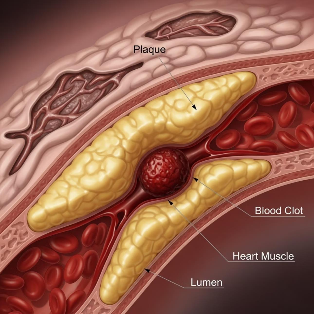 Plaque buildup can narrow arteries, leading to clots that completely obstruct blood flow and cause a heart attack.