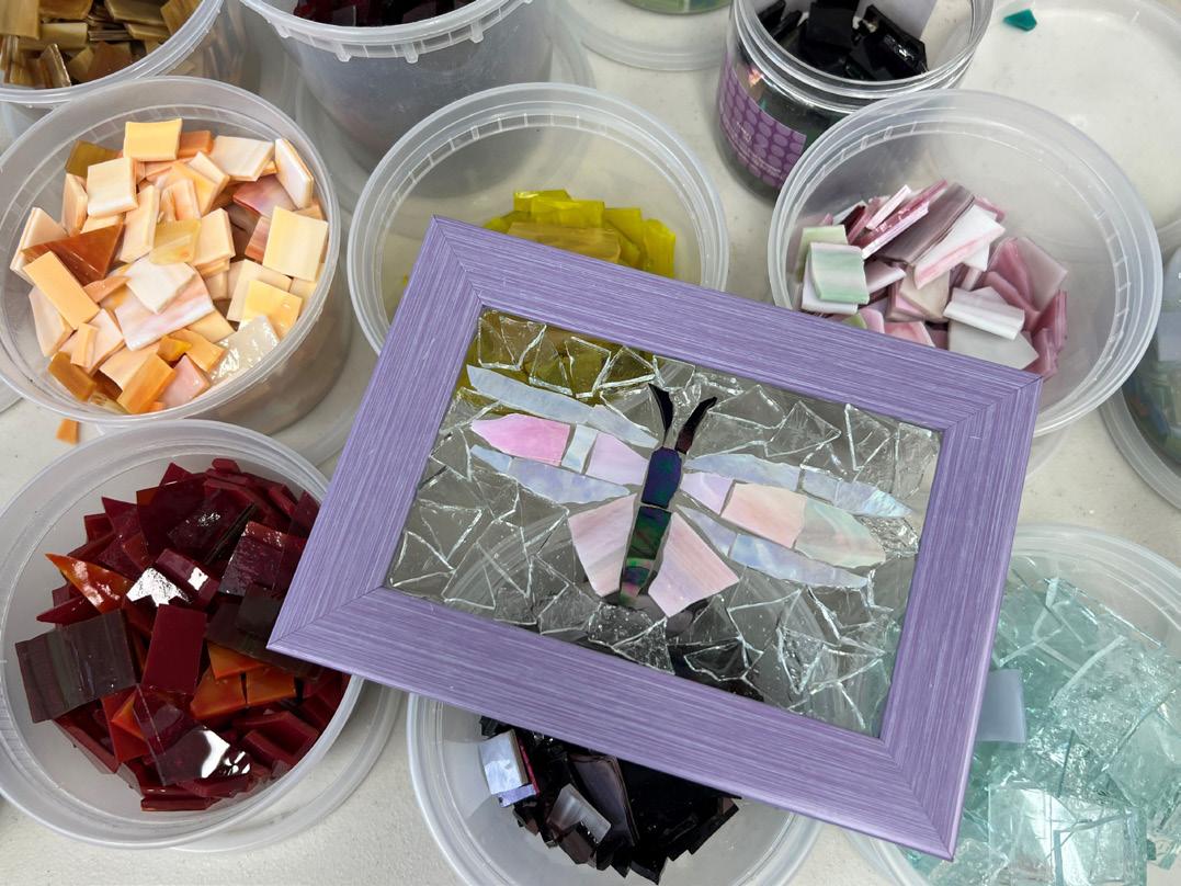 Mary Gaines is a self-taught artist who experimented in several mediums, including drawing, quilting, painting, clay, needlework, and several craft hobbies, before discovering her love for stained glass. She’s found that her style lies outside of the precision of traditional copper foiling and instead, Mary creates masterful mosaics. Mary likes to upcycle materials using bits of stained glass to create designs framed in old windows and repurposed picture frames. The color, sunlight, and beautiful flora and fauna of Florida keep her inspired to create her artwork.