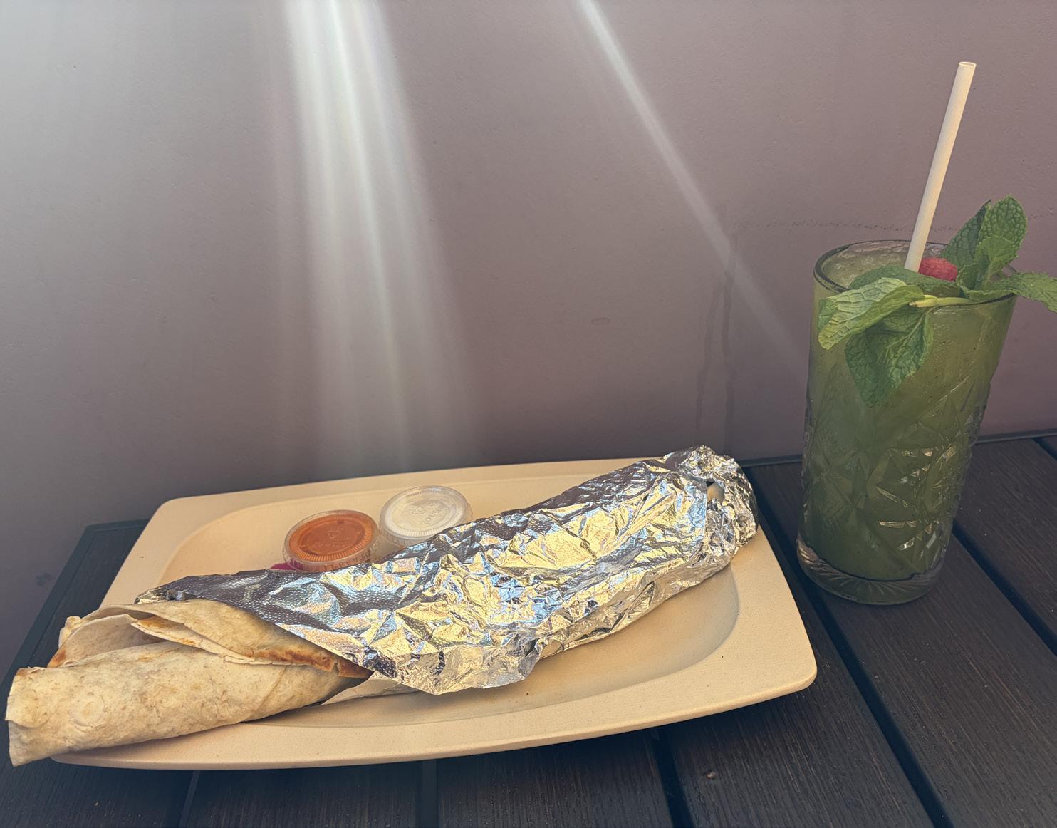 A shawarma wrapped in tin foil with dipping sauce and mint lemonade. to cool myself down on this warm afternoon.