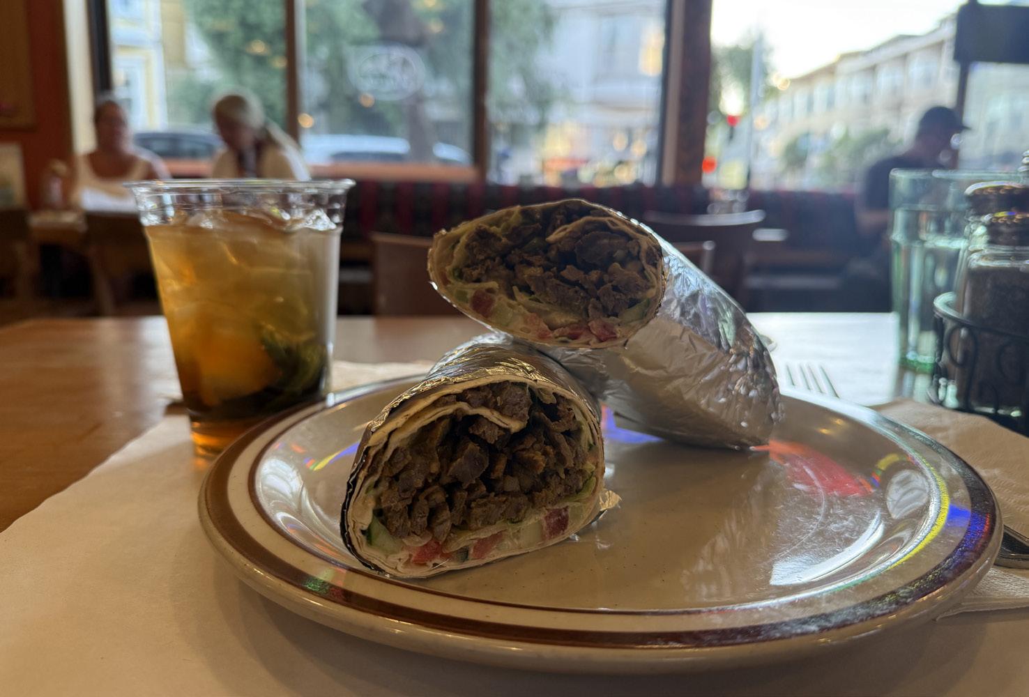 On this abnormally sunny day in San Francisco, where the wind blew pleasantly humid hot air into your face, I had the sudden urge to devour a shawarma. In between the vibrant, lively neighborhood of Haight Ashbury, lies Abu Salim Middle Eastern Grill, where they serve up Middle Eastern classics. Colored glass lined the top of the windows, emitting rainbow light onto customers. The faint smell of cigar smoke lingered, combined with rich spices used within the kitchen, a seemingly strange combination, but pleasant.