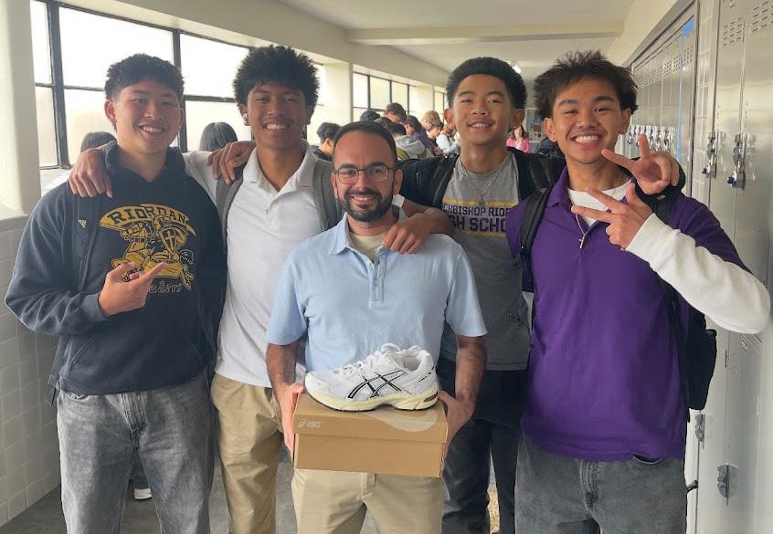 Seniors Diego Merida, Aidan Alday, Isaiah Sanchez, and Avery Agbunag bought teacher Nicholas Pellegrino a new pair of shoes to replace ones that were damaged on July 15, when he was attacked and robbed in Milan, Italy.