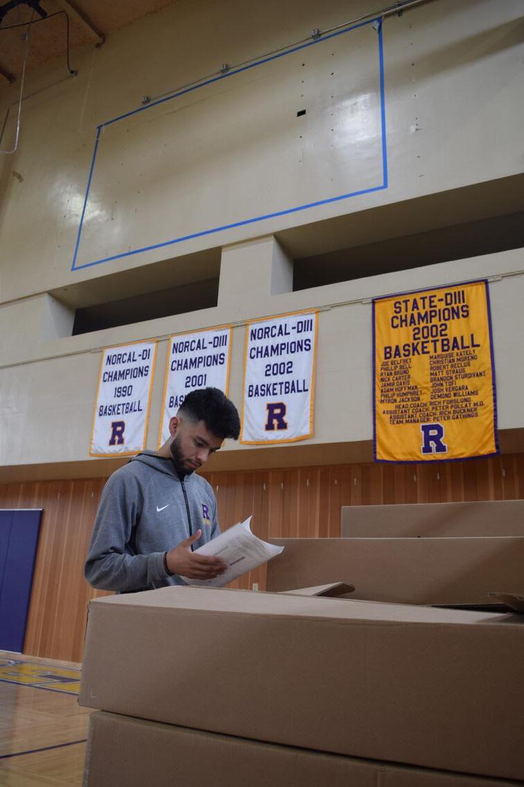 JV basketball head coach Alfonso Miranda ’17 reviews the installation plans for the new scoreboard – in the boxes – which will be placed on the wall above the banners this summer.