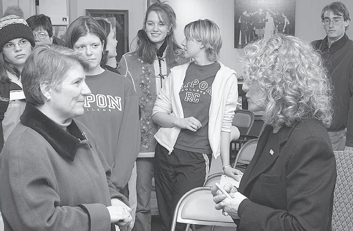 Noted singer Carole King visited campus last February to promote the presidential candidacy of Democrat John Kerry. Above King, right, visits with Registrar Michele Wittler who brought record jackets for King to autograph. The college museum in West Hall was filled to capacity for King who sang several songs. Ric Damm photos