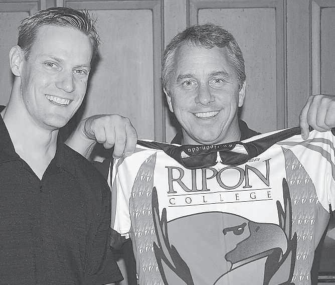 Assistant Director of College Relations Ric Damm, left, presents cycling legend and threetime Tour de France winner Greg LeMond with a Ripon College cycling jersey. Damm participated in the 2004 Trek 100 Ride for Hope, a charity ride to raise money for Midwest Athletes Against Childhood Cancer (MACC) Fund. By raising more than $1,000, Damm became a member of the inaugural Century Club and had the opportunity to meet and ride with LeMond.
