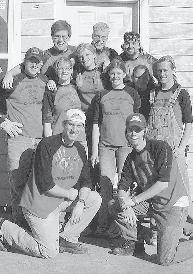 Ripon’s Habitat for Humanity chapter took its spring break project to Casper, Wyo. Ten Ripon students helped other volunteers and the future Habitat homeowner with installing siding and insulation and other projects. The Ripon group has traditionally gone South for the spring break build but this year opted for the cooler and scenic views of Wyoming. In front, from left, are Peter Kane ’05 of Champaign, Ill., and Reid Oven ’06 of White Bear Lake, Minn. In back, from left, are Stuart Russ ’07 of Wausaukee, Wis.; Justin Nelson ’07 of Blue Island, Ill.; Jenny Delaney ’07 of Rockford, Ill; Jordyn Rush ’07 of Poplar Grove, Ill.; Nathan Polum ’07 of Stevens Point, Wis.; Rebecca Malinowski ’07 of Orland Park, Ill.; Scott Mundro, Quads hall director and program coordinator for leadership and special programs; Amanda Zahn ’05 of Ripon, Wis.; and Mara Evans ’07 of Monona, Wis.