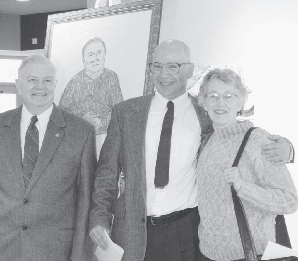 Jon Fasanelli-Cawelti ’75, center, poses with William Woolley, Professor of History and Victor and Carrie Palmer Chair for Leadership Values Emeritus, Woolley’s wife, Jean, and his portrait of his former professor. “As an intaglio printmaker first trained at Ripon, I sought to synthesize an historical figure (Bill) with the process of engraving and drypoint. With art and history so intertwined, in this way I could pay homage and thanks to Ripon College and one of its great professors,” says Fasanelli-Cawelti. The portrait was unveiled in April.