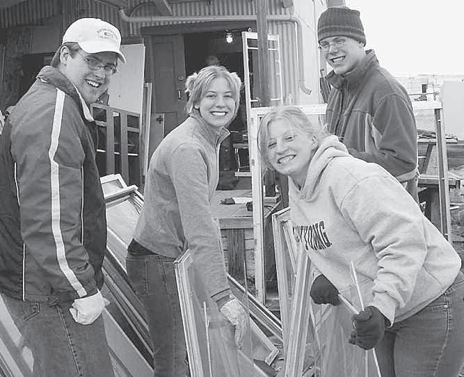 At left, loading glass at the Habitat project are, from left, Justin Nelson, Jenny Delaney, Jordyn Rush and Nathan Polum.