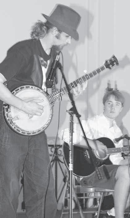 Matt Rhody ’04 of Ogema, Wis., plays the banjo and Travis Parker ’06 of Tiburon, Calif., perform as part of the annual Choraliers Variety Show this spring in Great Hall. Not shown is Michael Timm ’04 of Milwaukee who plays the harmonica as part of the group.