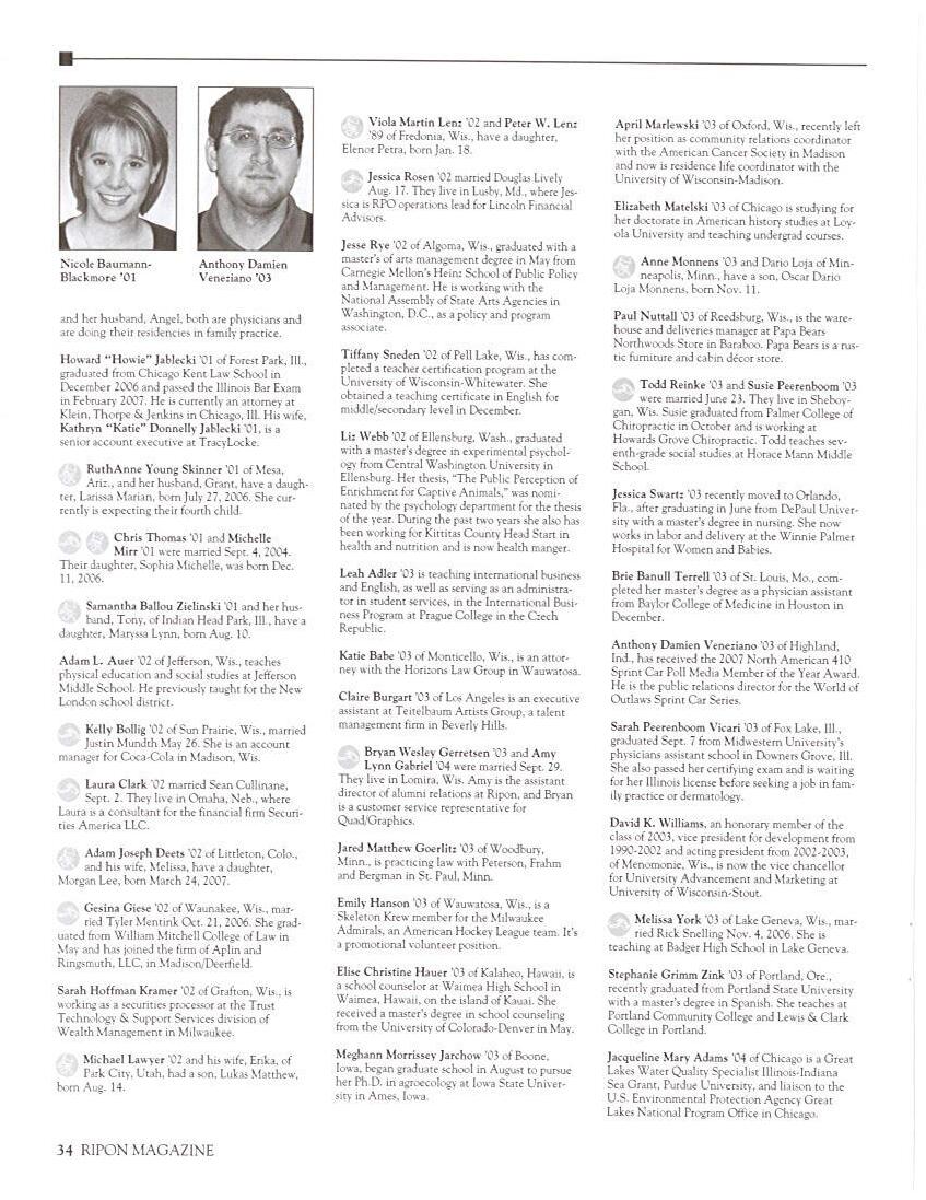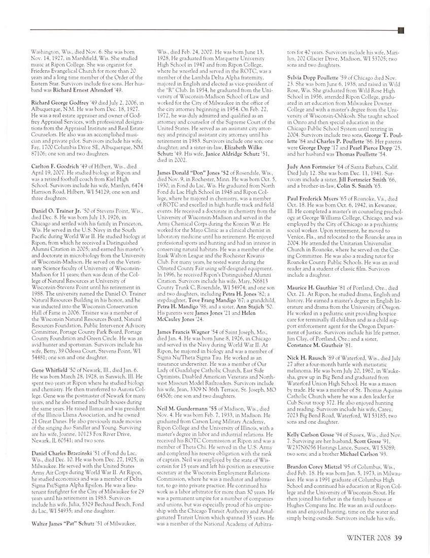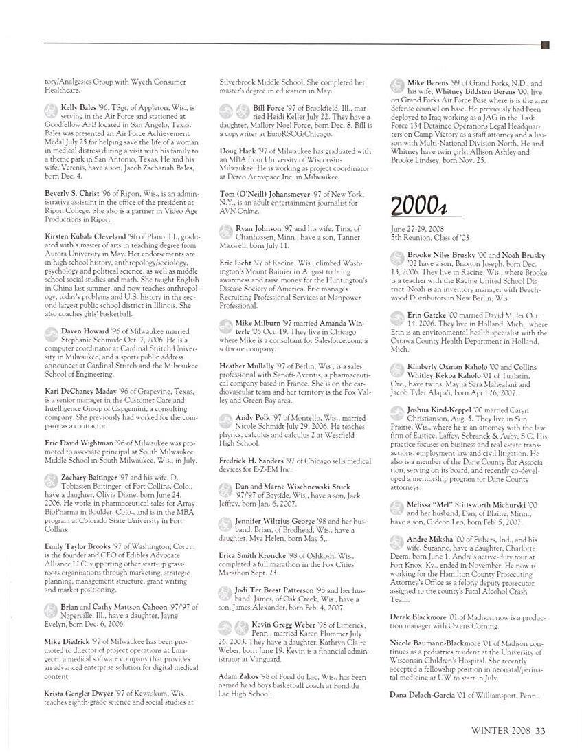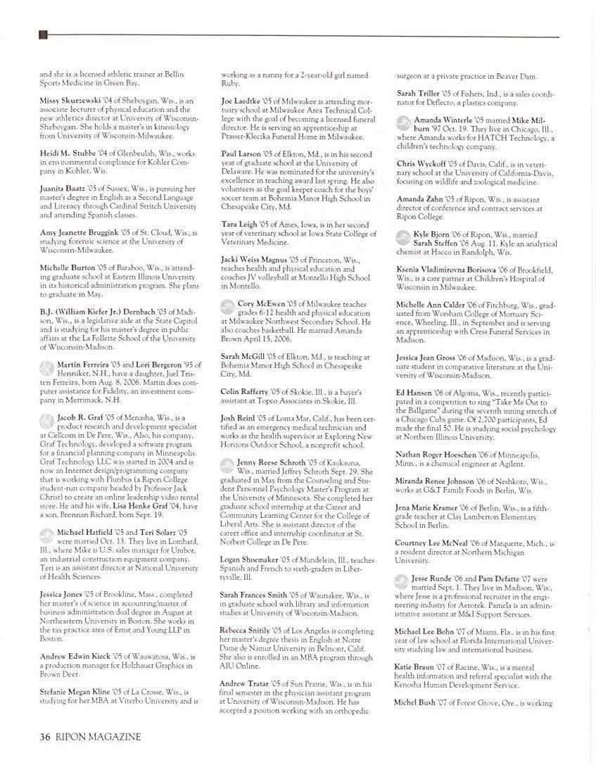 • In ,he Fall2007 issueof Riron Magazine. m,reported,hn,Jim H,in '08 uas thefirst Riponsuukm in m o de®leJ ro recei,-.:an undergraduatef,llou,1hip from theFun,lfor T heologicalEducation. Actually, Ben Ko,ucny '01 r,cei,,,d ,he sam, f,Ilo,,,shipthepre,•iousyear. Ko11;>01y 1sattendingVan,hbilt University Di,iniry SchoolinNruh,ille, Tenn., purn ,ing a master'sof di,inity degreeand ordinll!ionin theUnited Churchof Christ. In 1M r sarneissue u,1estated thtu GregoryMercier '1 I ofNewb1<ryPork, Calif., rearedaf,er 31 yeorsof beingon contTll<tfor theFBI ,\,!ercierreriredla.st May afcer 3 I yearsas a speci<IIagentand supen,sorfor theFBl's Los A ngelesfield office.His retirementla.std a lengthytwo u,eeksbefor, he retumedro ,he FBIas a conrrac r(1S$€Cjorfeiucreinle.srigator."It is myjob to go after ,he ilkgallygottenprojits nuidebJcriminalsoi.r agents are puttingattl(ly,u•heclierthecrin1ina4ari.i dn,g dea/eTs,fTaudstm, mobsters , gang bangers.tmorists or p,opfe « •ho prey on our children," St1)'S Nfer,ier.