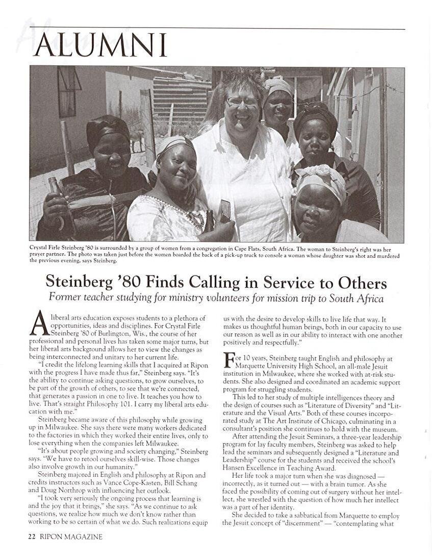 Crystal Stei nberg '80 taught high sch ool Englishand ph1losorhy for 10 years whe,, she decided it was time for a change. She no\,. is n earing t he e n d o f her se minary srud ies t o becon1e an ordai n ed minister. H er j ourney has led h e r to South Africa where she is hd ping to build achapd