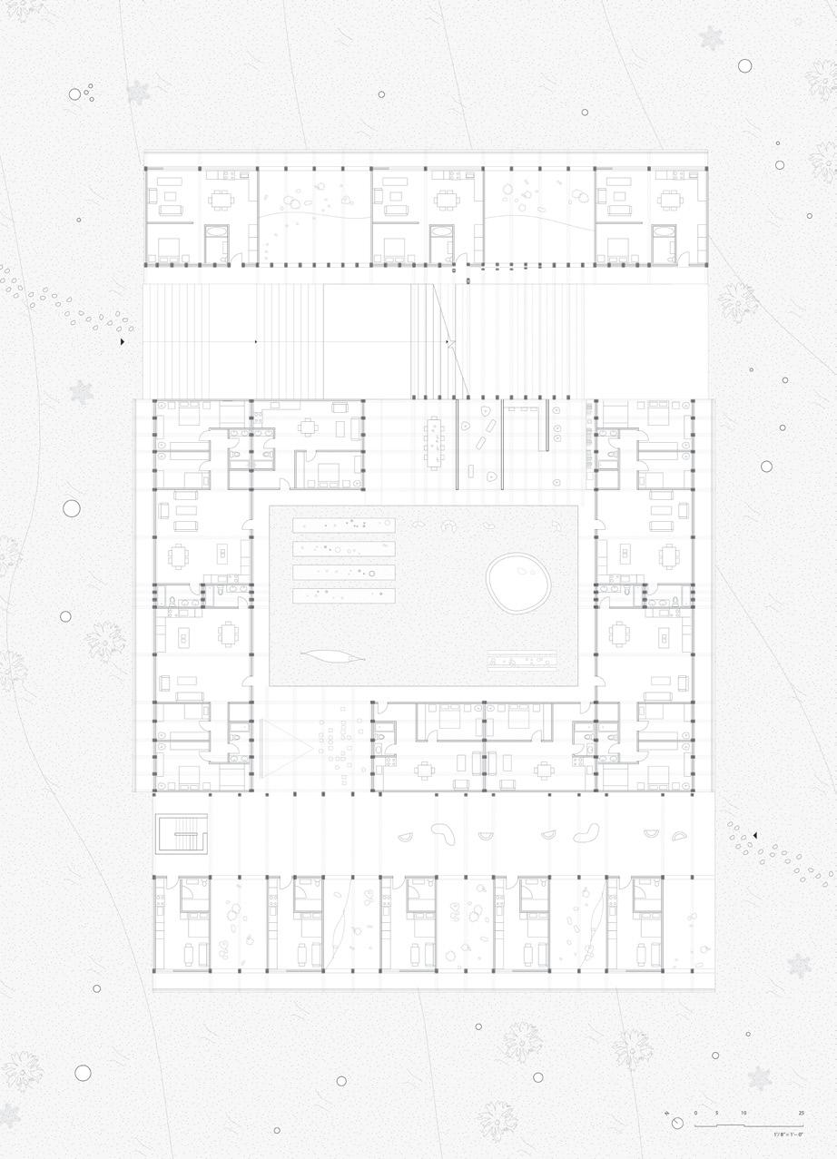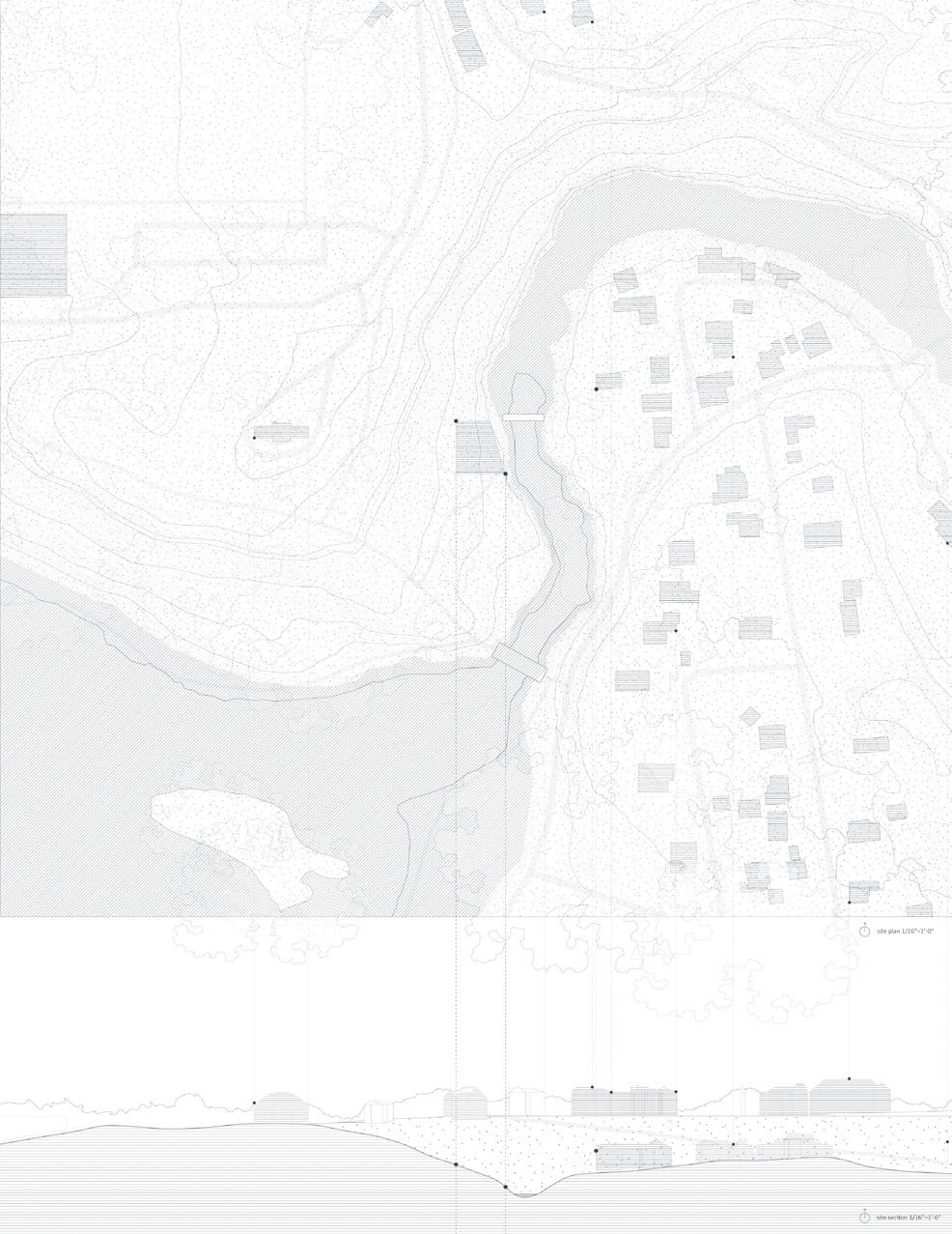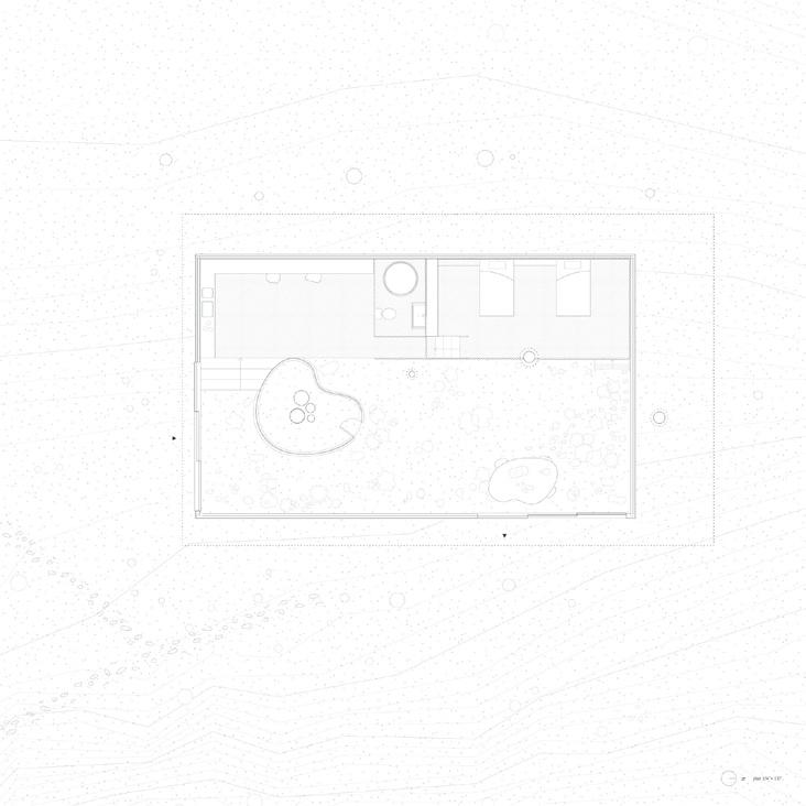 Located on a heavily wooded hillside overlooking Beebe Lake, the house is defined by a curved roof that follows the profile of the slope. Strategically punctuated at three places to best preserve the existing trees, the roof spans over a simple kitchen, a bath, a two-person bedroom and an earthen floor to the east, all of which could be divided into its own space by a set of curtain walls if need be.