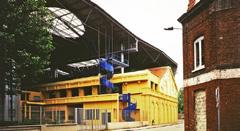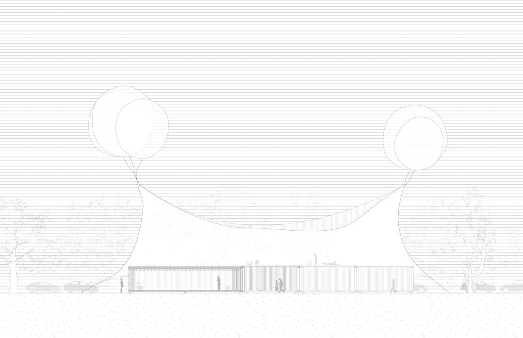 Made from recycled shipping containers, the naughty caterpillar is an itinerant creature that is constantly on the move, occasionally stopping at temporary destinations for carnivalesque purposes. On finer days, a couple of inflatable friends join the show to keep him company while adding more excitement to the scene.