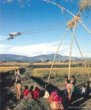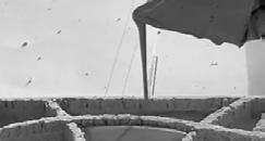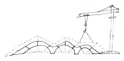 5. Fasten tiles onto strip to set the curve. 6. Footing poured from bamboo cylinders. 7. Assembly.