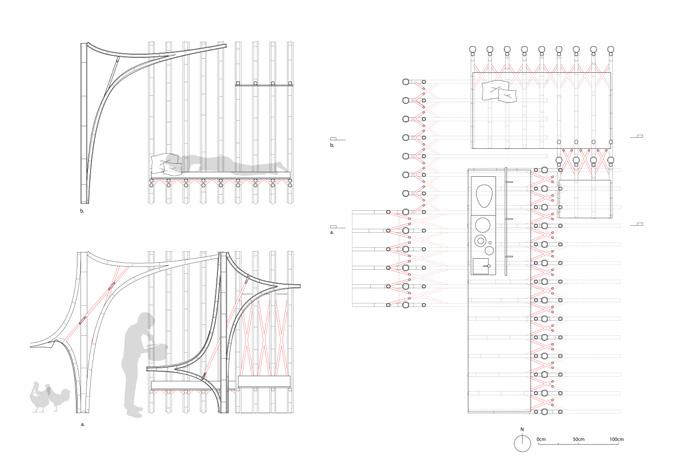 This housing project explores the idea of bamboo cantilever. Instead of using traditional cantilever, the project takes advantage of bamboo’s active bending and its light-weightness to form a new means of cantilevering with which one can begin to manipulate the curve to create a variety of spaces, such as a bench to sit on, a roof to linger under … The prototype was built with the help of my groupmates, Hoon and Milena, in the parallel seminar.