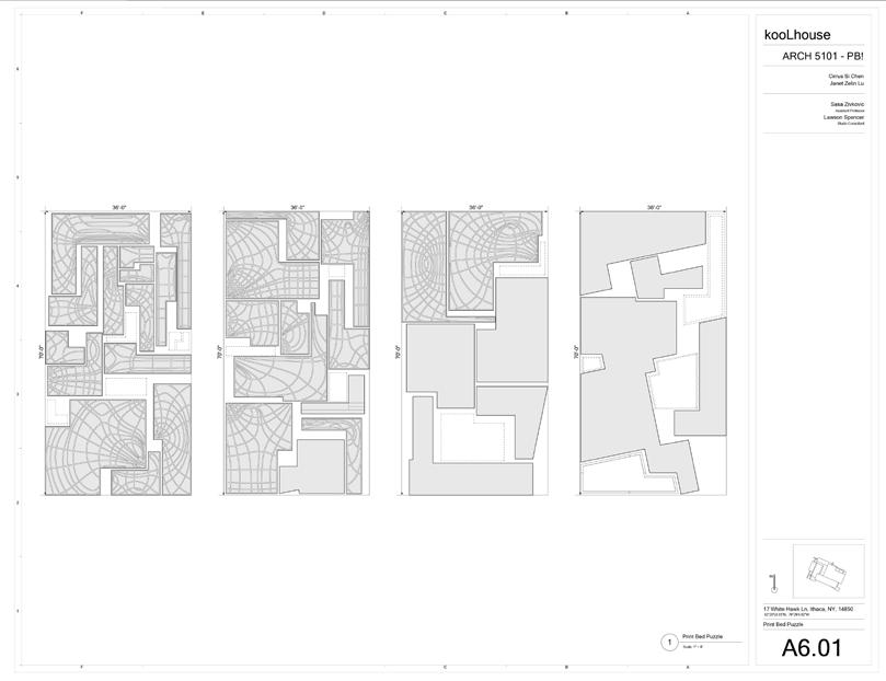 Designed with my partner Cirrus Chen for the Whitehawk Eco Village in Ithaca, the kooLhouse is a two-story 3D printed concrete house that derives its form and pattern from printing optimization. Its interlocking L shapes minimize printing rounds by seamlessly fitting on the print bed. Similar to the Nervi system, each L’s intricate pattern follows force distribution based on wall size and orientation. Additional concrete are strategically poured for further structural support. This method eliminates formwork, directing concrete only where needed, reducing material usage by 30% to 50%.