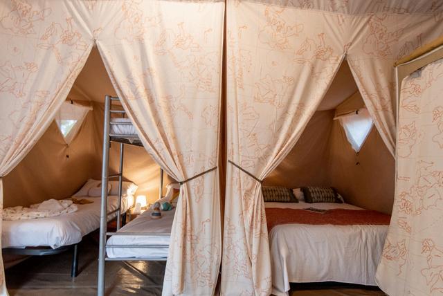 Welkom in onze Maori Lodge, een ruime en luxe safaritent met veranda. Ideaal voor 4 of5 personen, met een 2-persoonsbed, stapelbed en 1-persoonsbed De lodge beschikt over een volledig uitgeruste keuken met serviesgoed, koelkast met vriesvak, magnetron en gaskookplaat Ontspan op de overdekte veranda Geniet van de sfeerverlichting Je parkeert je auto gemakkelijk naast de lodge