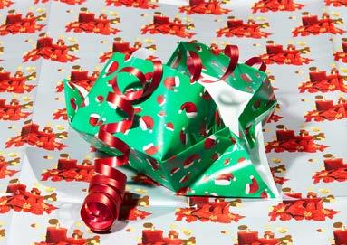Gavebånd, tau, hyssing, tape, isoporkuler og annen gavepynt kastes i restavfallet (eller ta vare på det til neste års julegaver).