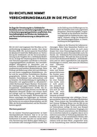 Mit 18.7.2017 sind insgesamt drei Novellen zur Gewerbeordnung kundgemacht worden. Eine dieser Novellen, BGBl. I Nr. 95/2017, passt die Vorschriften der §§ 365m ff. GewO über Maßnahmen zur Verhinderung der Geldwäsche und der Terrorismusfinanzierung an die Vorgaben der 4. Geldwäsche-Richtlinie an. Im Zuge der Umsetzung dieser EU-Richtlinie sind Versicherungsmakler und Berater in Versicherungsangelegenheiten verpflichtet, ihre Geschäftstätigkeit dahingehend zu überprüfen und zu bewerten, ob Risiken der Geldwäsche und Terrorismusfinanzierung bestehen (Risikoerhebung). Diese Prüfung und Bewertung richtet sich nach bestimmten vom Gesetz vorgegebenen Risikofaktoren. „Dabei sind die wesentlichen Risikofaktoren (Kunden, geographische Gebiete, Art der Dienstleistung, Standort, Vertriebskanal usw) aufzuzeichnen und zu bewerten. Die Risikoerhebung ist regelmäßig zu überprüfen und gegebenenfalls zu aktualisieren“, erklärt Rechtsanwalt Rupert Manhart, Vorsitzender der Arbeitsgruppe gegen Geldwäsche des Rats der Europäischen Anwaltskammern (CCBE). Die betreffenden Aufzeichnungen können von der MA 59 (Marktamt) überprüft werden und müssen dieser auf Anfrage auch zur Verfügung gestellt werden. Auch Banken, Versicherungen, Rechtsanwälte und Notare unterliegen den Regelungen zur Verhinderung von Geldwäsche und Terrorismusfinanzierung. Nur werden sie von anderen Körperschaften, wie der FMA, der Rechtsanwaltskammer und der Notariatskammer geprüft. Was kann passieren? Für die meisten Versicherungsvermittler ist Geldwäscheproblematik Neuland. Und es ist auf den ersten Blick auch schwer vorstellbar mit so etwas konfrontiert zu werden, was aber nur auf die klassische Versicherung eines Risikos gegen Zahlung einer laufenden oder einmaligen Prämie zutrifft. Hier