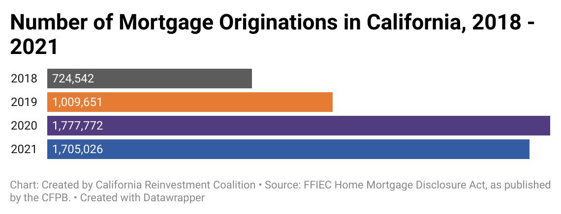 The skyrocketing amount of home loan originations in 2020 is well-documented. With record-low interest rates, millennials entering their prime homebuying years, remote work offering the opportunity to relocate to affordable markets, and direct cash infusions via stimulus payments, homebuying became uniquely affordable in spite of a global crisis. Mortgage lending in California mirrored national trends, with 768,121 more loan originations in 2020 than in 2019.