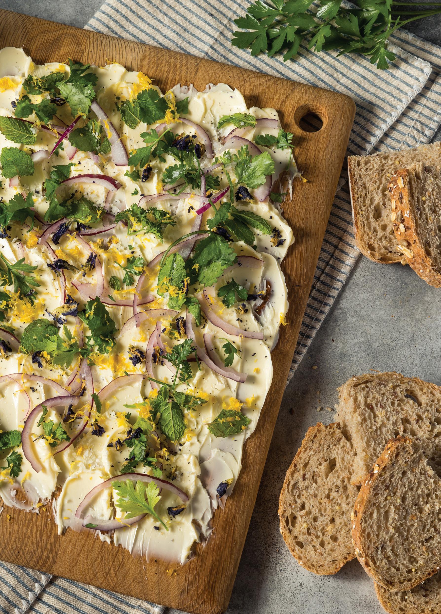• Sprinkle with a liberal layer of flakey salt and citrus zest (both add brightness & depth to the butter).